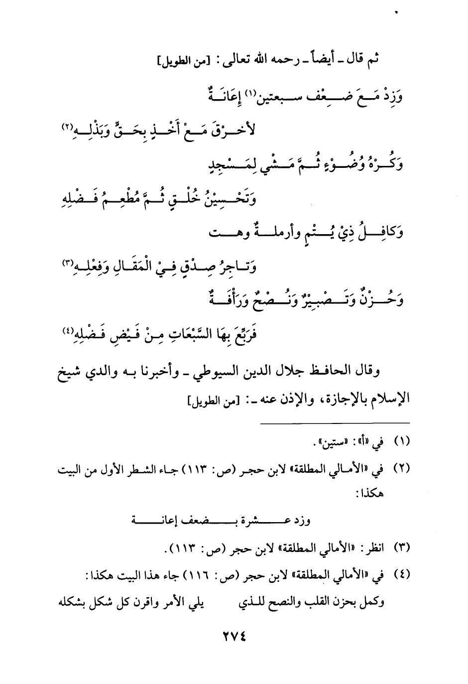 (¬4) في "الأمالي المطلقة" لابن حجر (ص: 116) جاء هذا البيت هكذا: