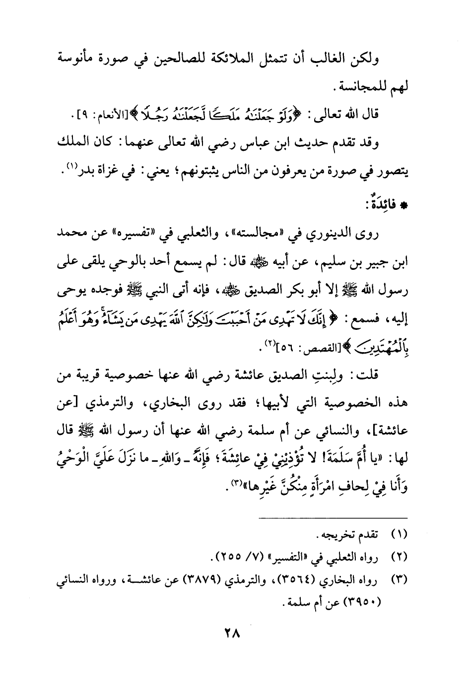 قلت: ولِبنتِ الصديق عائشة رضي الله عنها خصوصية قريبة من هذه الخصوصية التي لأبيها؛ فقد روى البخاري، والترمذي [عن عائشة]، والنسائي عن أم سلمة رضي الله عنها أن رسول الله - صلى الله عليه وسلم - قال لها: "يا أُمَّ سَلَمَةَ! لا تُؤْذِيْنيْ فِيْ عائِشَةَ؛ فَإِنَّهُ - وَاللهِ - ما نزَلَ عَلَيَّ الْوَحْيُ وَأَنا فِيْ لِحافِ امْرَأةٍ منْكُنَّ غَيْرِها" (¬3).