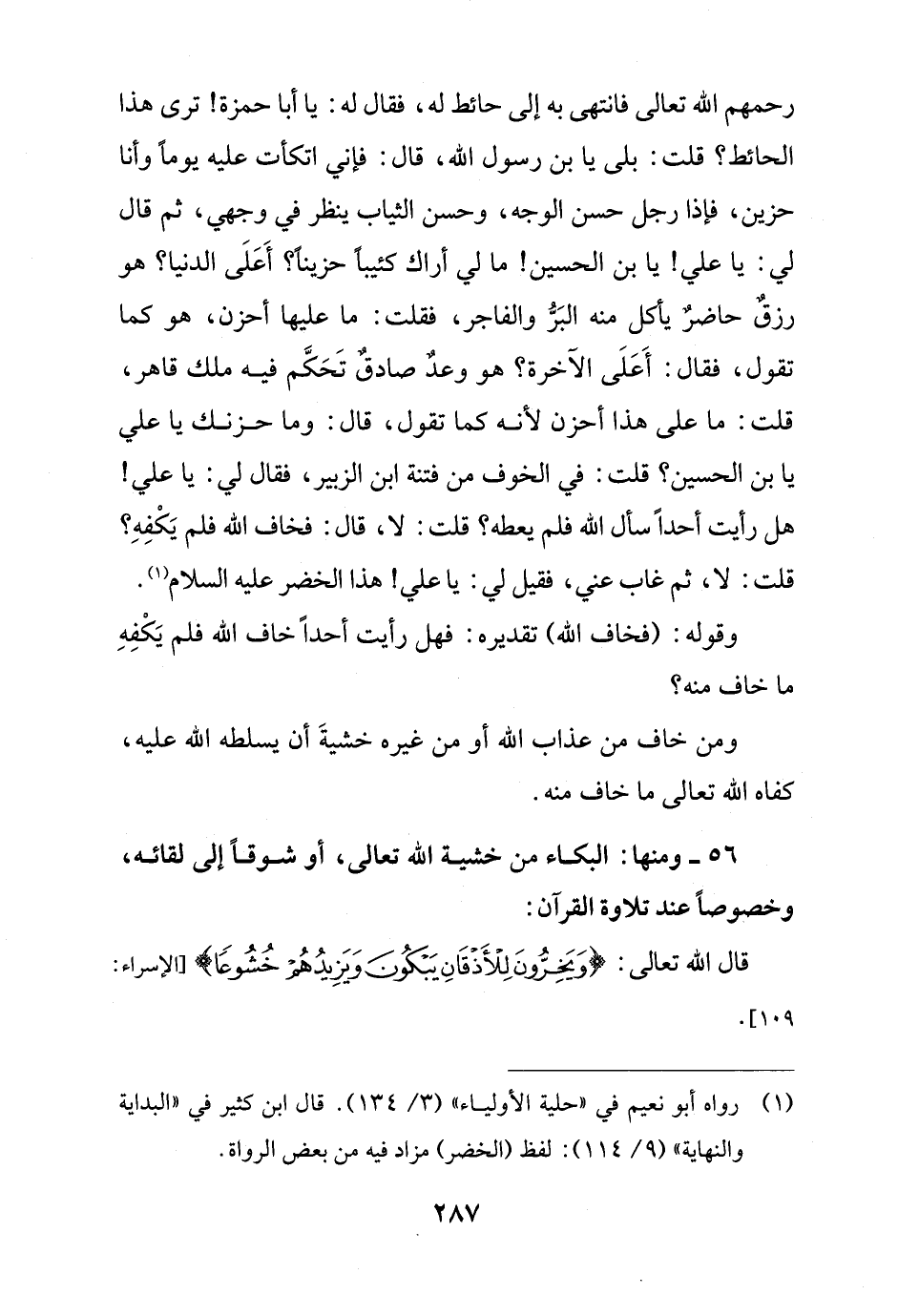 رحمهم الله تعالى فانتهى به إلى حائط له، فقال له: يا أبا حمزة! ترى هذا الحائط؟ قلت: بلى يا بن رسول الله، قال: فإني اتكأت عليه يوماً وأنا حزين، فإذا رجل حسن الوجه، وحسن الثياب ينظر في وجهي، ثم قال لي: يا علي! يا بن الحسين! ما لي أراك كئيبا حزيناً؟ أَعَلَى الدنيا؟ هو رزقٌ حاضرٌ يأكل منه البَرُّ والفاجر، فقلت: ما عليها أحزن، هو كما تقول، فقال: أَعَلَى الآخرة؟ هو وعدٌ صادقٌ تَحَكَّم فيه ملك قاهر، قلت: ما على هذا أحزن لأنه كما تقول، قال: وما حزنك يا علي يا بن الحسين؟ قلت: في الخوف من فتنة ابن الزبير، فقال لي: يا علي! هل رأيت أحداً سأل الله فلم يعطه؟ قلت: لا، قال: فخاف الله فلم يَكْفِهِ؟ قلت: لا، ثم غاب عني، فقيل لي: يا علي! هذا الخضر عليه السلام (¬1).