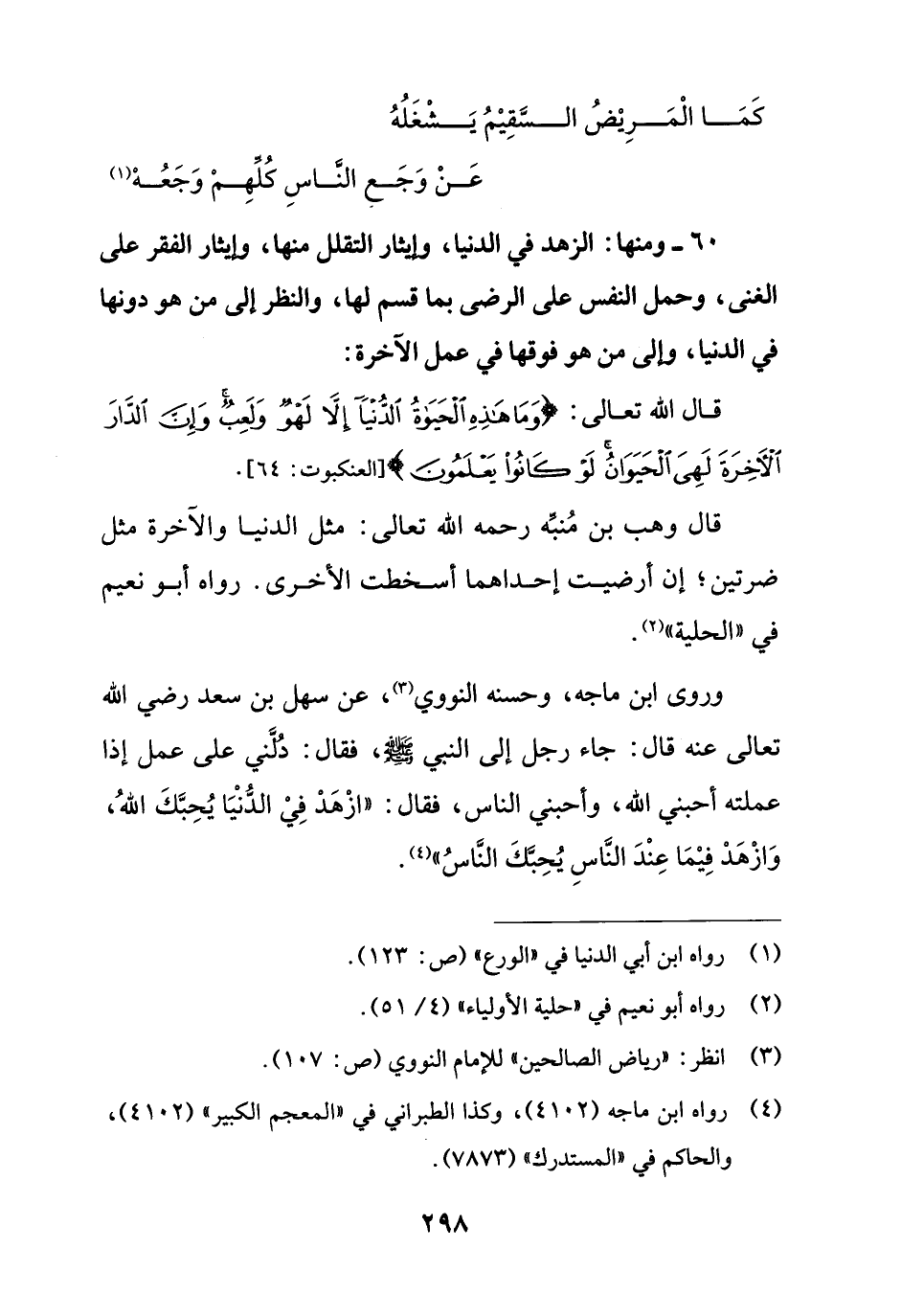 وروى ابن ماجه، وحسنه النووي (¬3)، عن سهل بن سعد رضي الله تعالى عنه قال: جاء رجل إلى النبي - صلى الله عليه وسلم -، فقال: دُلَّني على عمل إذا عملته أحبني الله، وأحبني الناس، فقال: "ازْهَدْ فِيْ الدُّنْيَا يُحِبَّكَ اللهُ، وَازْهَدْ فِيْمَا عِنْدَ النَّاسِ يُحِبَّكَ النَّاسُ" (¬4).
