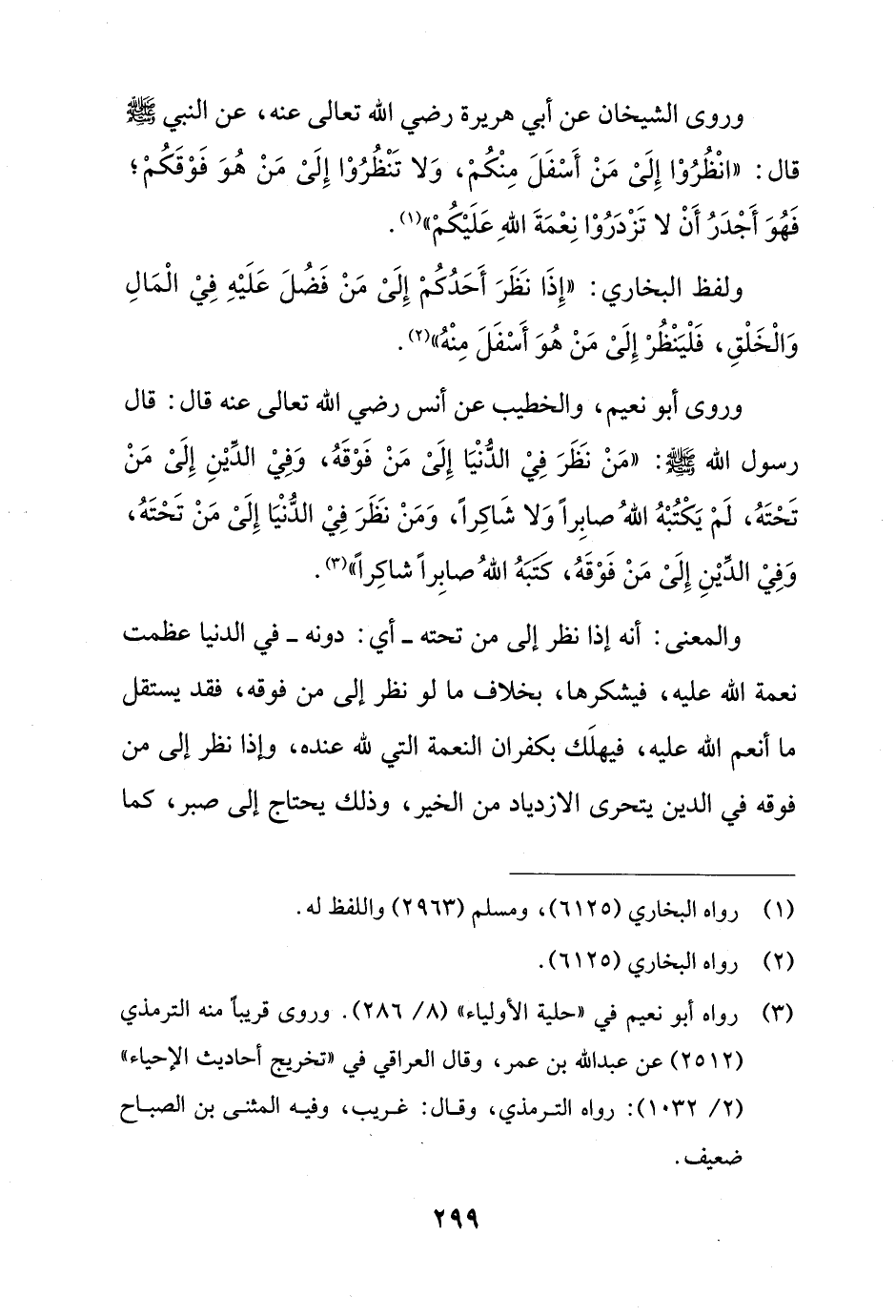 وروى الشيخان عن أبي هريرة رضي الله تعالى عنه، عن النبي - صلى الله عليه وسلم - قال: "انْظُرُوْا إِلَىْ مَنْ أَسْفَلَ مِنْكُمْ، وَلا تَنْظُرُوْا إِلَىْ مَنْ هُوَ فَوْقَكُمْ؛ فَهُوَ أَجْدَرُ أَنْ لا تَزْدَرُوْا نِعْمَةَ اللهِ عَلَيْكُمْ" (¬1).