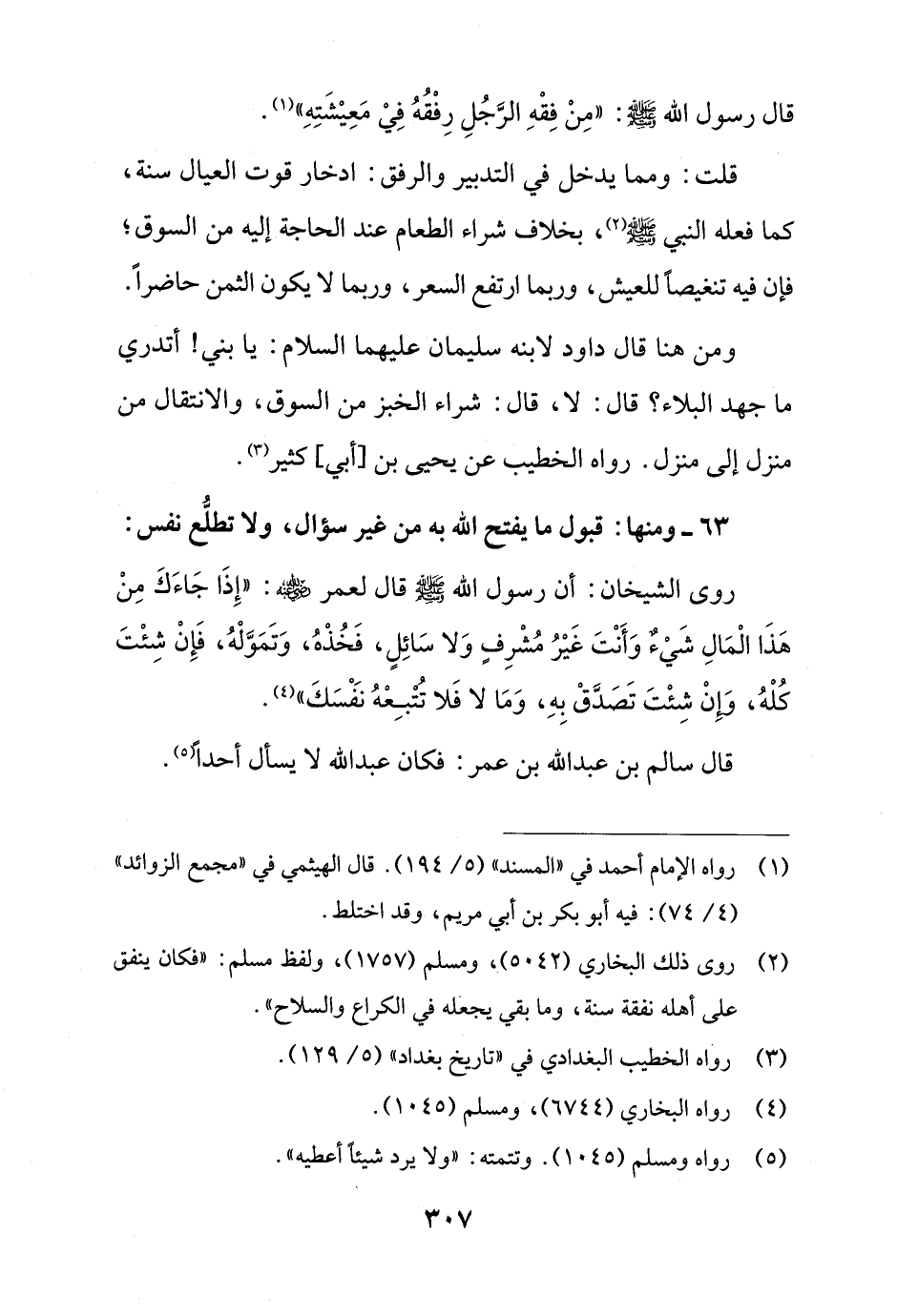روى الشيخان: أن رسول الله - صلى الله عليه وسلم - قال لعمر - رضي الله عنه -: "إِذَا جَاءَكَ مِنْ هَذَا الْمَالِ شَيْءٌ وَأَنْتَ غَيْرُ مُشْرِفٍ وَلا سَائِلٍ، فَخُذْهُ، وَتَمَوَّلْهُ، فَإِنْ شِئْتَ كُلْهُ، وَإِن شِئْتَ تَصَدَّقْ بِهِ، وَمَا لا فَلا تُتْبِعْهُ نَفْسَكَ" (¬4).