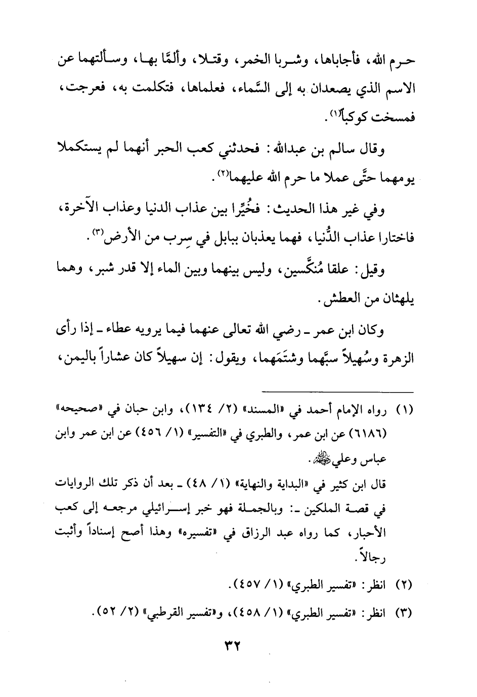 حرم الله، فأجاباها، وشربا الخمر، وقتلا، وألمَّا بها، وسألتهما عن الاسم الذي يصعدان به إلى السَّماء، فعلماها، فتكلمت به، فعرجت، فمسخت كوكباً (¬1).