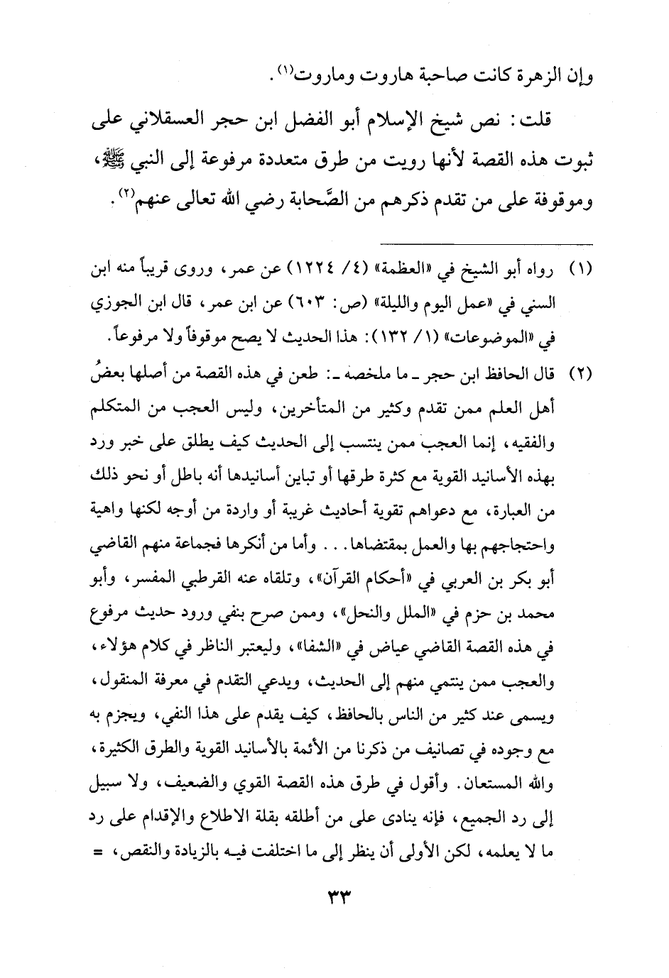 (¬2) قال الحافظ ابن حجر - ما ملخصه -: طعن في هذه القصة من أصلها بعضُ أهل العلم ممن تقدم وكثير من المتأخرين، وليس العجب من المتكلم والفقيه، إنما العجب ممن ينتسب إلى الحديث كيف يطلق على خبر ورد بهذه الأسانيد القوية مع كثرة طرقها أو تباين أسانيدها أنه باطل أو نحو ذلك من العبارة، مع دعواهم تقوية أحاديث غريبة أو واردة من أوجه لكنها واهية واحتجاجهم بها والعمل بمقتضاها ... وأما من أنكرها فجماعة منهم القاضي أبو بكر بن العربي في "أحكام القرآن"، وتلقاه عنه القرطبي المفسر، وأبو محمد بن حزم في "الملل والنحل"، وممن صرح بنفي ورود حديث مرفوع في هذه القصة القاضي عياض في "الشفا"، وليعتبر الناظر في كلام هؤلاء، والعجب ممن ينتمي منهم إلى الحديث، ويدعي التقدم في معرفة المنقول، ويسمى عند كثير من الناس بالحافظ، كيف يقدم على هذا النفي، ويجزم به مع وجوده في تصانيف من ذكرنا من الأئمة بالأسانيد القوية والطرق الكثيرة، والله المستعان. وأقول في طرق هذه القصة القوي والضعيف، ولا سبيل إلى رد الجميع، فإنه ينادى على من أطلقه بقلة الاطلاع والإقدام على رد ما لا يعلمه، لكن الأولى أن ينظر إلى ما اختلفت فيه بالزيادة والنقص، =