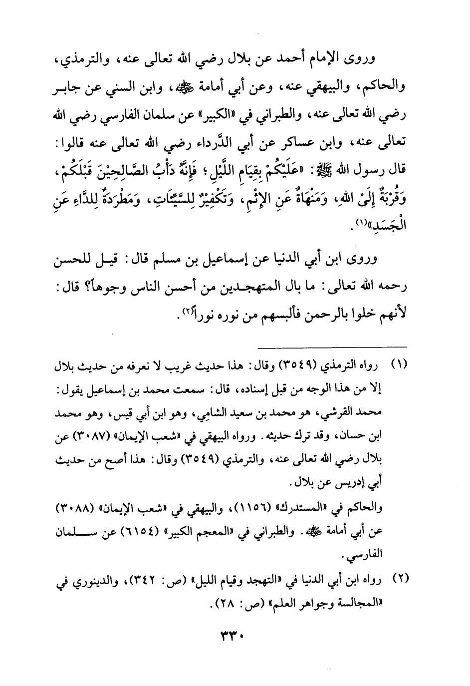 وروى الإمام أحمد عن بلال رضي الله تعالى عنه، والترمذي، والحاكم، والبيهقي عنه، وعن أبي أمامة - رضي الله عنه -، وابن السني عن جابر رضي الله تعالى عنه، والطبراني في "الكبير" عن سلمان الفارسي رضي الله تعالى عنه، وابن عساكر عن أبي الدَّرداء رضي الله تعالى عنه قالوا: قال رسول الله - صلى الله عليه وسلم -: "عَلَيْكُمْ بِقِيَامِ اللَّيْلِ؛ فَإِنَّهُ دَأْبُ الصَّالِحِيْنَ قَبْلَكُمْ، وَقُرْبَةٌ إِلَىْ اللهِ، وَمَنْهَاةٌ عَنِ الإِثْمِ، وَتَكْفِيْرٌ لِلسَّيِّاتِ، وَمَطْرَدَةٌ لِلدَّاءِ عَنِ الْجَسَدِ" (¬1).
