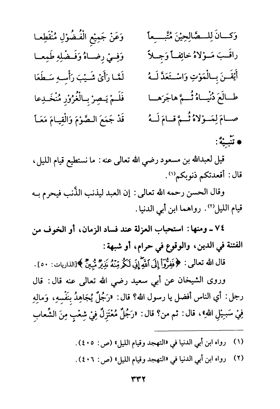 74 - ومنها: استحباب العزلة عند فساد الزمان، أو الخوف من الفتنة في الدين، والوقوع في حرام، أو شبهة: