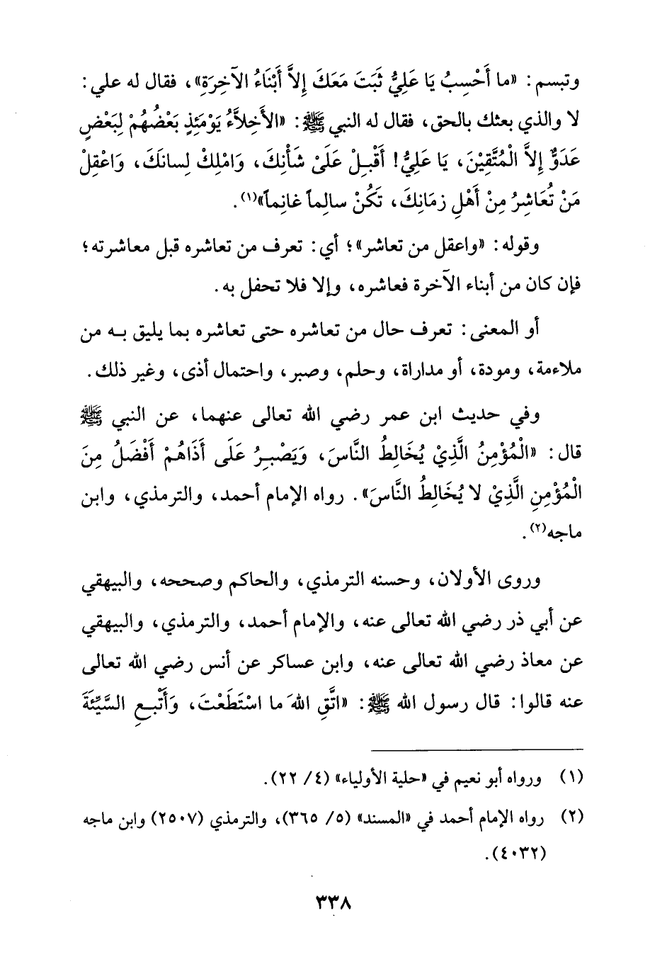 قال: "الْمُؤْمِنُ الَّذِيْ يُخَالِطُ النَّاسَ، وَيَصْبِرُ عَلَى أَذَاهُمْ أَفْضَلُ مِنَ الْمُؤْمِنِ الَّذِيْ لا يُخَالِطُ النَّاسَ". رواه الإمام أحمد، والترمذي، وابن ماجه (¬2).