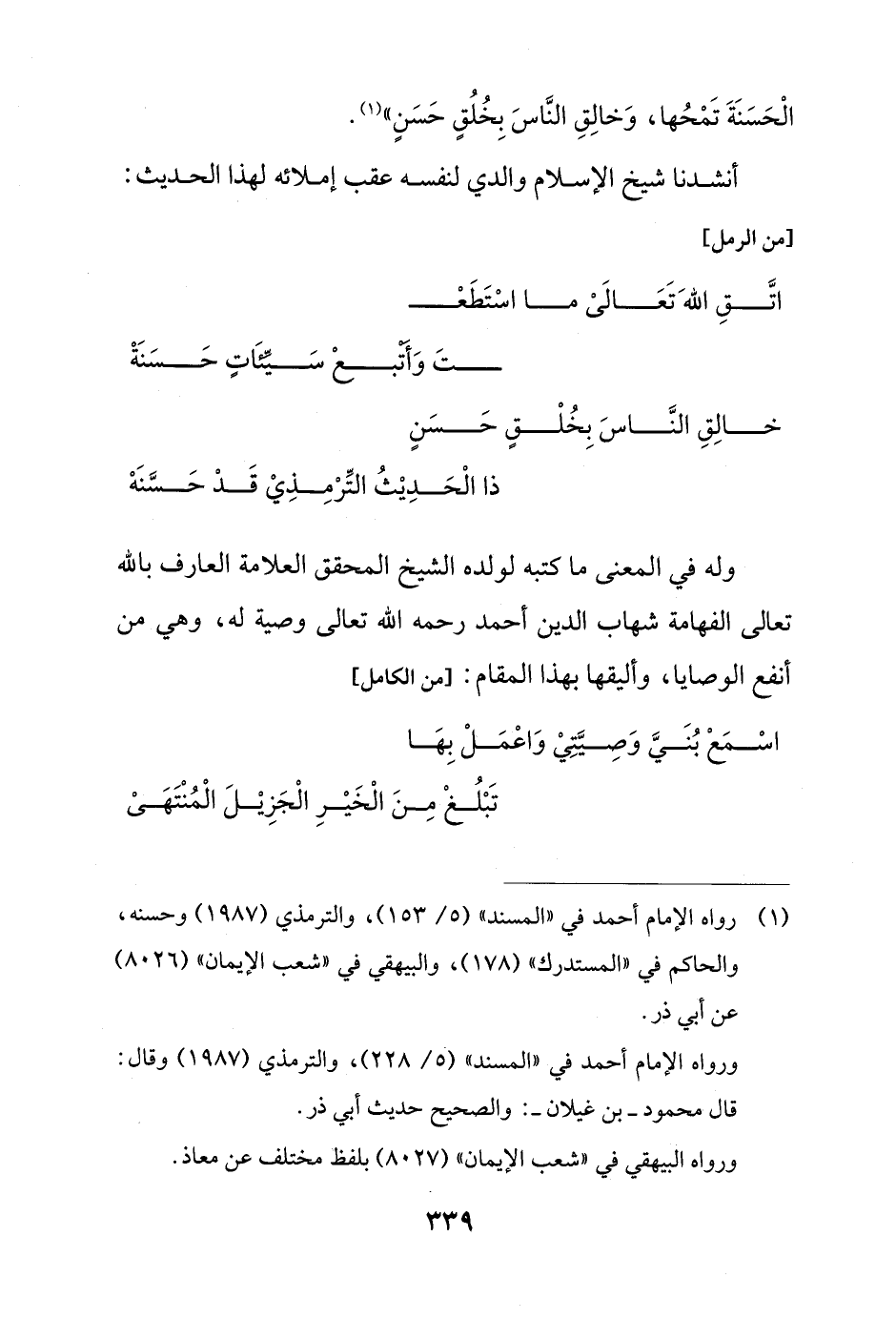 خالِقِ النَّاسَ بِخُلْقٍ حَسَنٍ ... ذا الْحَدِيْثُ التِّرْمِذِيْ قَدْ حَسَّنَهْ