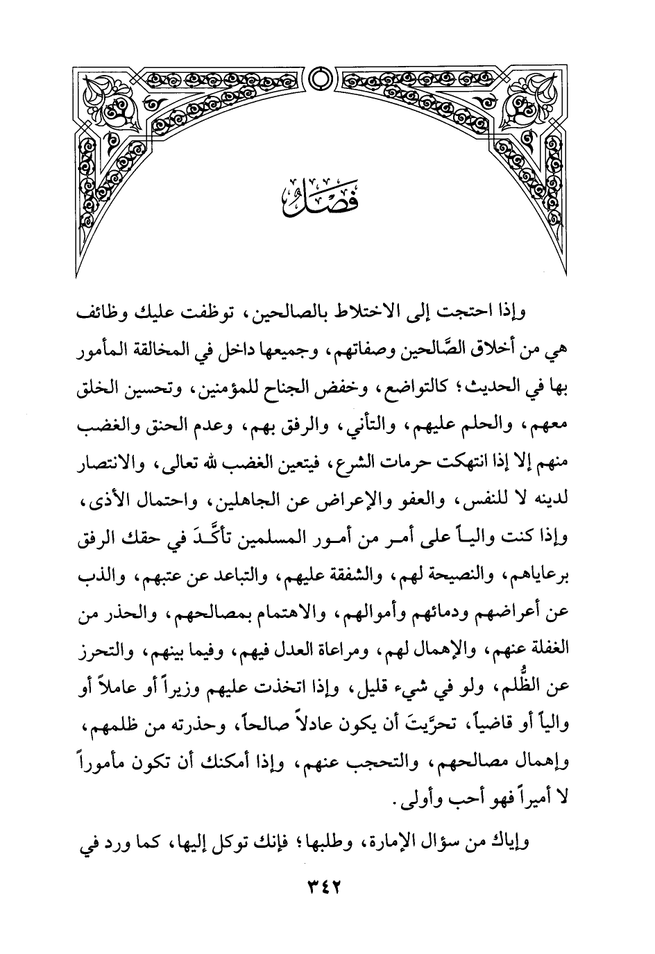 وإذا احتجت إلى الاختلاط بالصالحين، توظفت عليك وظائف هي من أخلاق الصَّالحين وصفاتهم، وجميعها داخل في المخالقة المأمور بها في الحديث؛ كالتواضع، وخفض الجناح للمؤمنين، وتحسين الخلق معهم، والحلم عليهم، والتأني، والرفق بهم، وعدم الحنق والغضب منهم إلا إذا انتهكت حرمات الشرع، فيتعين الغضب لله تعالى، والانتصار لدينه لا للنفس، والعفو والإعراض عن الجاهلين، واحتمال الأذى، وإذا كنت والياً على أمر من أمور المسلمين تأكَّدَ في حقك الرفق برعاياهم، والنصيحة لهم، والشفقة عليهم، والتباعد عن عتبهم، والذب عن أعراضهم ودمائهم وأموالهم، والاهتمام بمصالحهم، والحذر من الغفلة عنهم، والإهمال لهم، ومراعاة العدل فيهم، وفيما بينهم، والتحرز عن الظُّلم، ولو في شيء قليل، وإذا اتخذت عليهم وزيراً أو عاملاً أو والياً أو قاضياً، تحرَّيتَ أن يكون عادلاً صالحاً، وحذرته من ظلمهم، وإهمال مصالحهم، والتحجب عنهم، وإذا أمكنك أن تكون مأموراً لا أميراً فهو أحب وأولى.