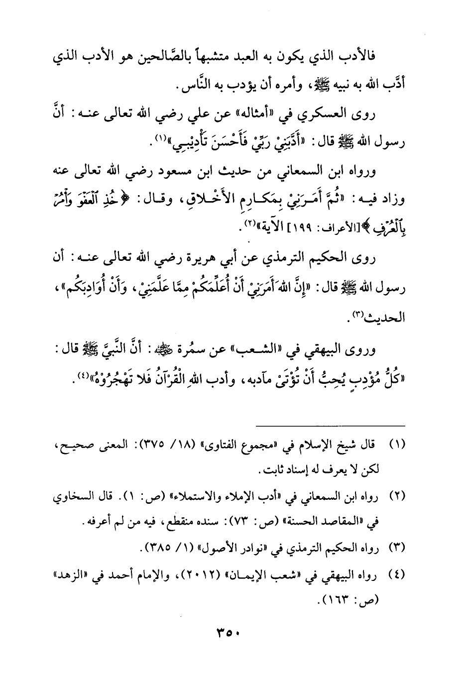 فالأدب الذي يكون به العبد متشبهاً بالصَّالحين هو الأدب الذي أدَّب الله به نبيه - صلى الله عليه وسلم -، وأمره أن يؤدب به النَّاس.