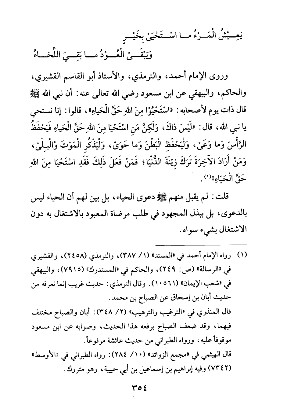 قلت: لم يقبل منهم - صلى الله عليه وسلم - دعوى الحياء، بل بين لهم أن الحياء ليس بالدعوى، بل ببذل المجهود في طلب مرضاة المعبود بالاشتغال به دون الاشتغال بشيء سواه.