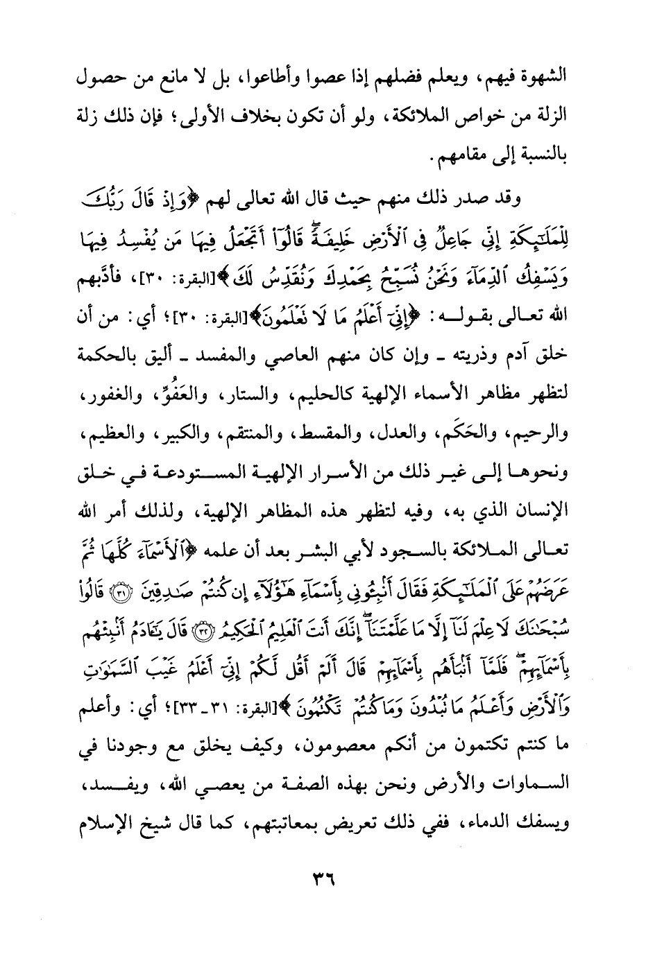 وقد صدر ذلك منهم حيث قال الله تعالى لهم {وَإِذْ قَالَ رَبُّكَ لِلْمَلَائِكَةِ إِنِّي جَاعِلٌ فِي الْأَرْضِ خَلِيفَةً قَالُوا أَتَجْعَلُ فِيهَا مَنْ يُفْسِدُ فِيهَا وَيَسْفِكُ الدِّمَاءَ وَنَحْنُ نُسَبِّحُ بِحَمْدِكَ وَنُقَدِّسُ لَكَ} [البقرة: 30]، فأدَّبهم الله تعالى بقوله: {إِنِّي أَعْلَمُ مَا لَا تَعْلَمُونَ} [البقرة: 30]، أي: من أن خلق آدم وذريته - وإن كان منهم العاصي والمفسد - أليق بالحكمة لتظهر مظاهر الأسماء الإلهية كالحليم، والستار، والعَفُوِّ، والغفور، والرحيم، والحَكَم، والعدل، والمقسط، والمنتقم، والكبير، والعظيم، ونحوها إلى غير ذلك من الأسرار الإلهية المستودعة في خلق الإنسان الذي به، وفيه لتظهر هذه المظاهر الإلهية، ولذلك أمر الله تعالى الملائكة بالسجود لأبي البشر بعد أن علمه {الْأَسْمَاءَ كُلَّهَا ثُمَّ عَرَضَهُمْ عَلَى الْمَلَائِكَةِ فَقَالَ أَنْبِئُونِي بِأَسْمَاءِ هَؤُلَاءِ إِنْ كُنْتُمْ صَادِقِينَ (31) قَالُوا سُبْحَانَكَ لَا عِلْمَ لَنَا إِلَّا مَا عَلَّمْتَنَا إِنَّكَ أَنْتَ الْعَلِيمُ الْحَكِيمُ (32) قَالَ يَاآدَمُ أَنْبِئْهُمْ بِأَسْمَائِهِمْ فَلَمَّا أَنْبَأَهُمْ بِأَسْمَائِهِمْ قَالَ أَلَمْ أَقُلْ لَكُمْ إِنِّي أَعْلَمُ غَيْبَ السَّمَاوَاتِ وَالْأَرْضِ وَأَعْلَمُ مَا تُبْدُونَ وَمَا كُنْتُمْ تَكْتُمُونَ} [البقرة: 31 - 33]، أي: وأعلم ما كنتم تكتمون من أنكم معصومون، وكيف يخلق مع وجودنا في السماوات والأرض ونحن بهذه الصفة من يعصي الله، ويفسد، ويسفك الدماء، ففي ذلك تعريض بمعاتبتهم، كما قال شيخ الإسلام
