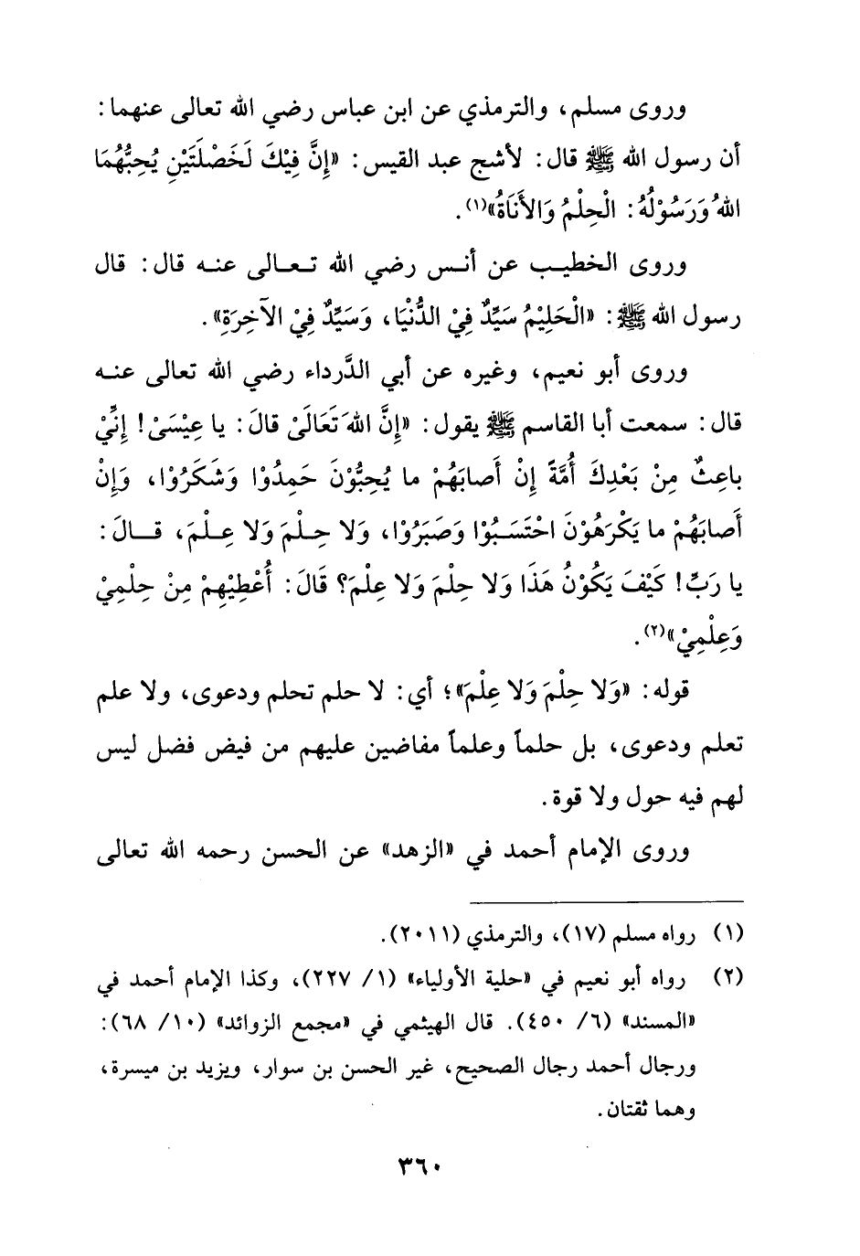وروى مسلم، والترمذي عن ابن عباس رضي الله تعالى عنهما: أن رسول الله - صلى الله عليه وسلم - قال: لأشج عبد القيس: "إِنَّ فِيْكَ لَخَصْلَتَيْنِ يُحِبُّهُمَا اللهُ وَرَسُوْلُهُ: الْحِلْمُ وَالأَناَةُ" (¬1).