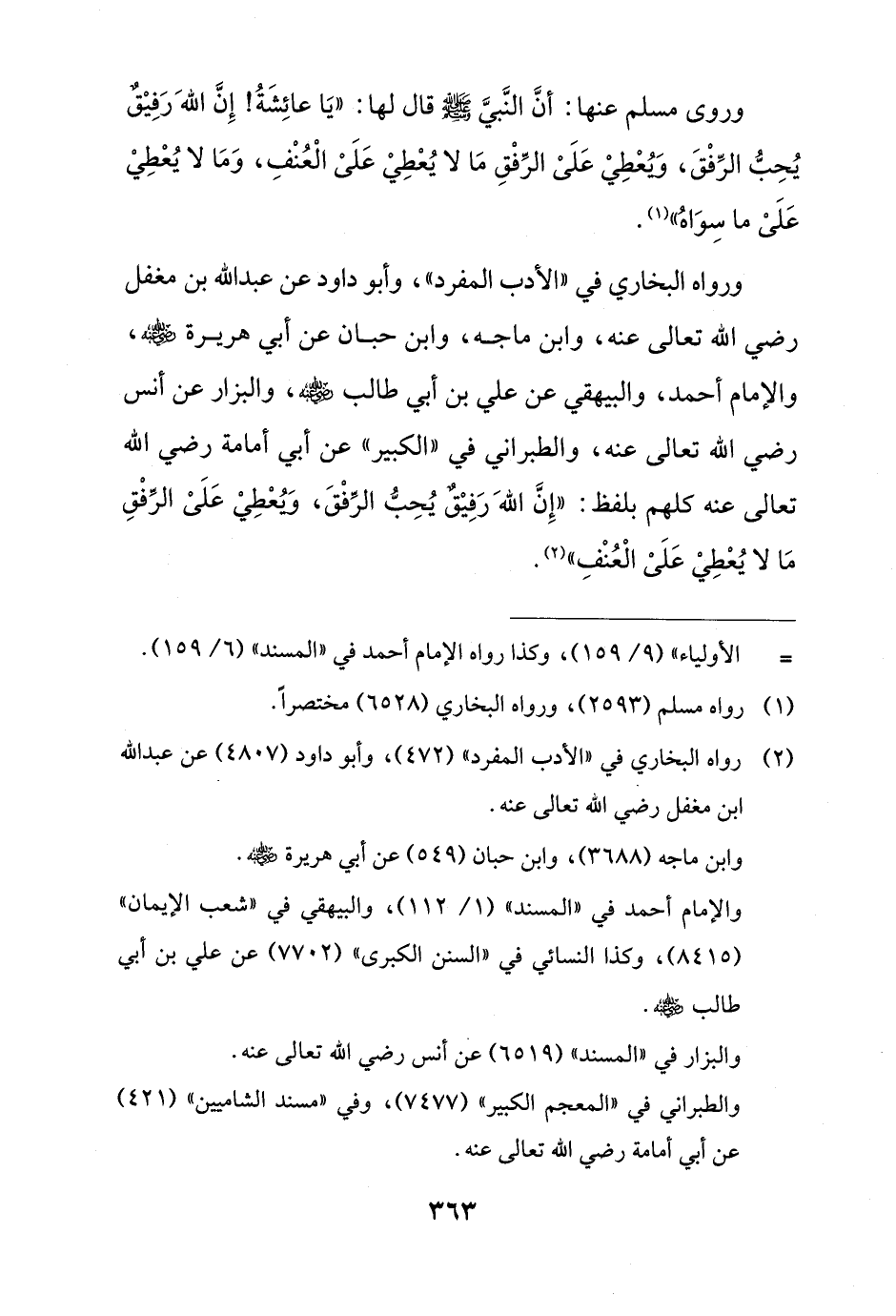 ورواه البخاري في "الأدب المفرد"، وأبو داود عن عبد الله بن مغفل رضي الله تعالى عنه، وابن ماجه، وابن حبان عن أبي هريرة - رضي الله عنه -، والإمام أحمد، والبيهقي عن علي بن أبي طالب - رضي الله عنه -، والبزار عن أنس رضي الله تعالى عنه، والطبراني في "الكبير" عن أبي أمامة رضي الله تعالى عنه كلهم بلفظ: "إِنَّ اللهَ رَفِيْق يُحِبُّ الرِّفْقَ، وَيُعْطِيْ عَلَى الرِّفْقِ مَا لا يُعْطِيْ عَلَى الْعُنْفِ" (¬2).