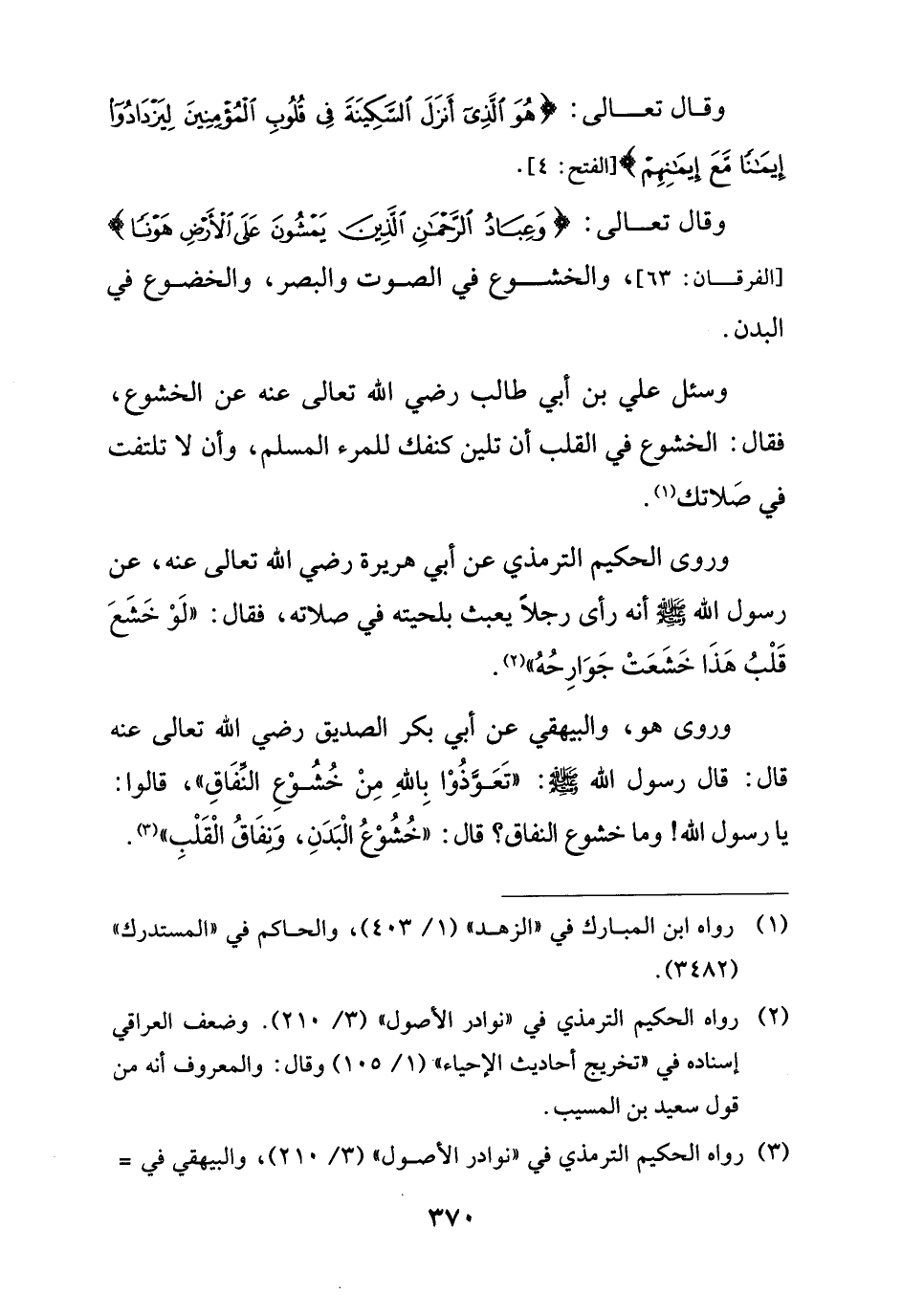 وروى الحكيم الترمذي عن أبي هريرة رضي الله تعالى عنه، عن رسول الله - صلى الله عليه وسلم - أنه رأى رجلًا يعبث بلحيته في صلاته، فقال: "لَوْ خَشَعَ قَلْبُ هَذَا خَشَعَتْ جَوَارِحُهُ" (¬2).