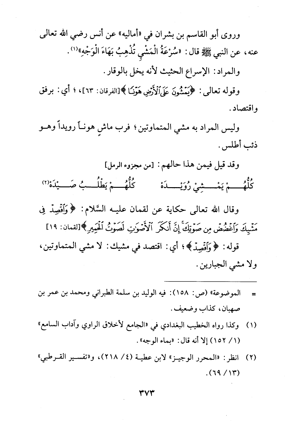 وروى أبو القاسم بن بشران في "أماليه" عن أنس رضي الله تعالى عنه، عن النبي - صلى الله عليه وسلم - قال: "سُرْعَةُ الْمَشْيِ تُذْهِبُ بَهَاءَ الْوَجْهِ" (¬1).