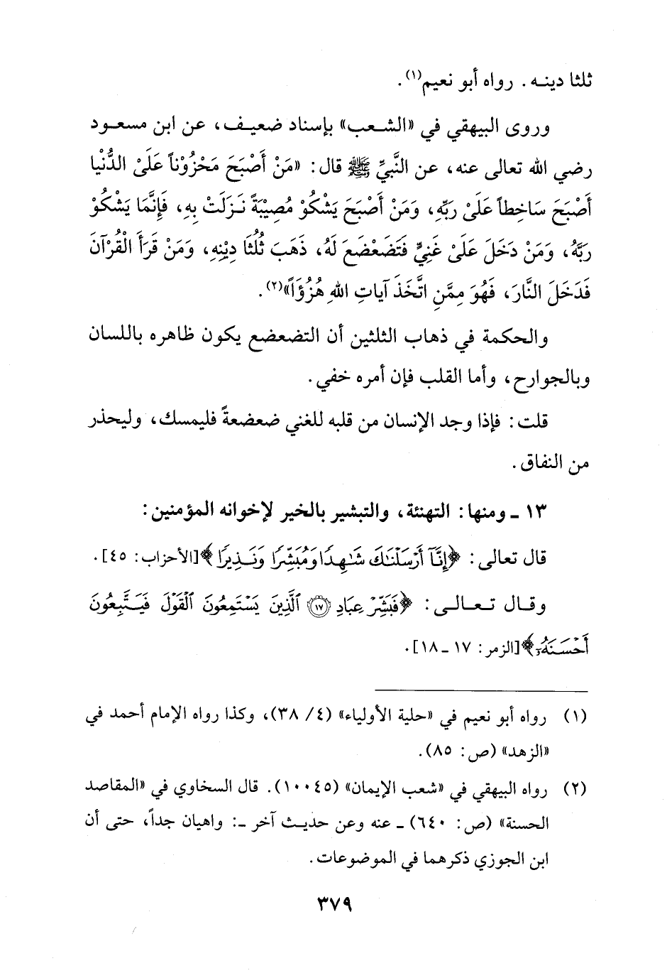 وروى البيهقي في "الشعب" بإسناد ضعيف، عن ابن مسعود رضي الله تعالى عنه، عن النَّبي - صلى الله عليه وسلم - قال: "مَنْ أَصْبَحَ مَحْزُوْنًا عَلَى الدُّنْيا أَصْبَحَ سَاخِطًا عَلَى رَبِّهِ، وَمَنْ أَصْبَحَ يَشْكُوْ مُصِيْبَةً نَزَلَتْ بِهِ، فَإِنَّمَا يَشْكُوْ رَبَّهُ، وَمَنْ دَخَلَ عَلَىْ غَنِيٍّ فتَضَعْضَعَ لَهُ، ذَهَبَ ثُلُثَا دِيْنِهِ، وَمَنْ قَرَأَ الْقُرْآنَ فَدَخَلَ النَّارَ، فَهُوَ مِمَّنِ اتَّخَذَ آياتِ اللهِ هُزُؤًا" (¬2).