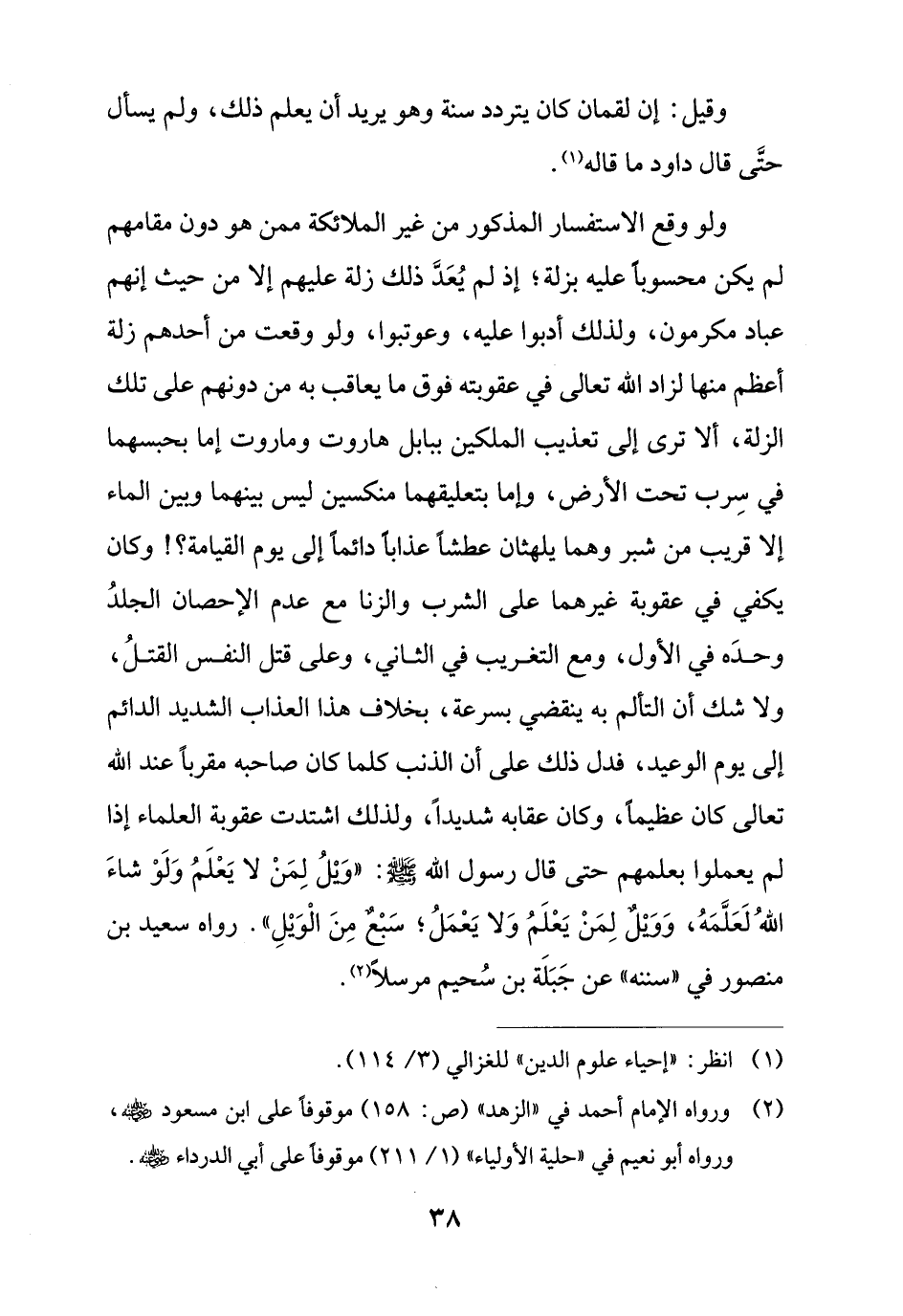 ولو وقع الاستفسار المذكور من غير الملائكة ممن هو دون مقامهم لم يكن محسوباً عليه بزلة؛ إذ لم يُعَدَّ ذلك زلة عليهم إلا من حيث إنهم عباد مكرمون، ولذلك أدبوا عليه، وعوتبوا، ولو وقعت من أحدهم زلة أعظم منها لزاد الله تعالى في عقوبته فوق ما يعاقب به من دونهم على تلك الزلة، ألا ترى إلى تعذيب الملكين ببابل هاروت وماروت إما بحبسهما في سِرب تحت الأرض، واما بتعليقهما منكسين ليس بينهما ويين الماء إلا قريب من شبر وهما يلهثان عطشاً عذابا دائماً إلى يوم القيامة؟ ! وكان يكفي في عقوبة غيرهما على الشرب والزنا مع عدم الإحصان الجلدُ وحده في الأول، ومع التغريب في الثاني، وعلى قتل النفس القتلُ، ولا شك أن التألم به ينقضي بسرعة، بخلاف هذا العذاب الشديد الدائم إلى يوم الوعيد، فدل ذلك على أن الذنب كلما كان صاحبه مقرباً عند الله تعالى كان عظيماً، وكان عقابه شديداً، ولذلك اشتدت عقوبة العلماء إذا لم يعملوا بعلمهم حتى قال رسول الله - صلى الله عليه وسلم -: "ويلُ لِمَنْ لا يَعْلَمُ وَلَوْ شاءَ اللهُ لَعَلَّمَهُ، وَويلٌ لِمَنْ يَعْلَمُ وَلا يَعْمَلُ؛ سَبع مِنَ الْوَيْلِ". رواه سعيد بن منصور في "سننه" عن جَبَلَة بن سُحيم مرسلاً (¬2).