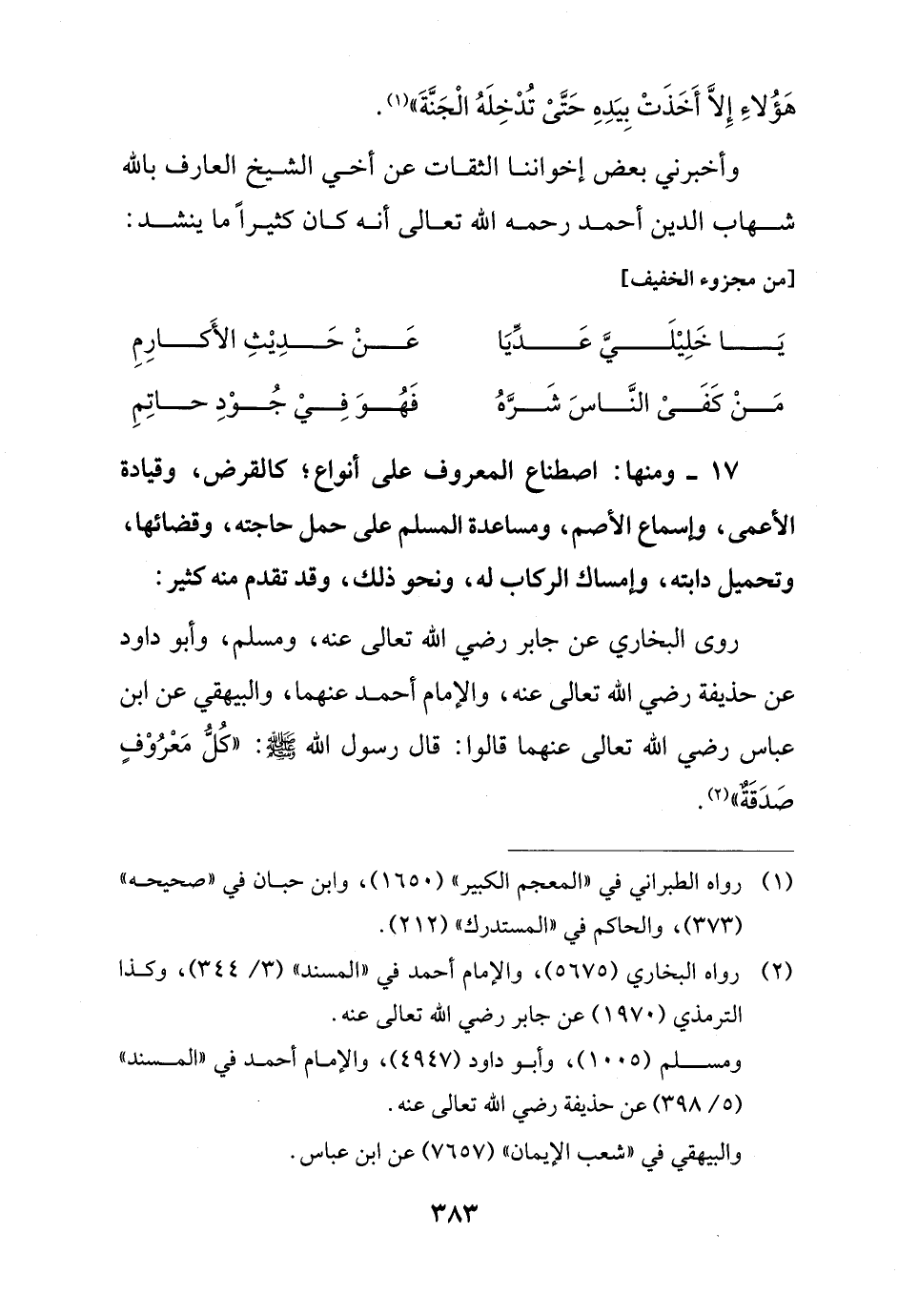 17 - ومنها: اصطناع المعروف على أنواع؛ كالقرض، وقيادة الأعمى، وإسماع الأصم، ومساعدة المسلم على حمل حاجته، وقضائها، وتحميل دابته، وإمساك الركاب له، ونحو ذلك، وقد تقدم منه كثير: