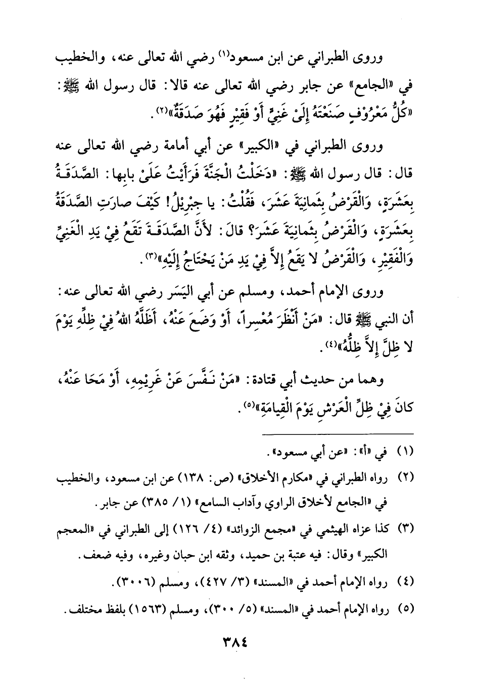 وروى الإمام أحمد، ومسلم عن أبي اليَسَر رضي الله تعالى عنه: أن النبي - صلى الله عليه وسلم - قال: "مَنْ أنظَرَ مُعْسِرًا، أَوْ وَضَعَ عَنْهُ، أَظَلَّهُ اللهُ فِيْ ظِلِّهِ يَوْمَ لا ظِلَّ إِلَّا ظِلُّهُ" (¬4).