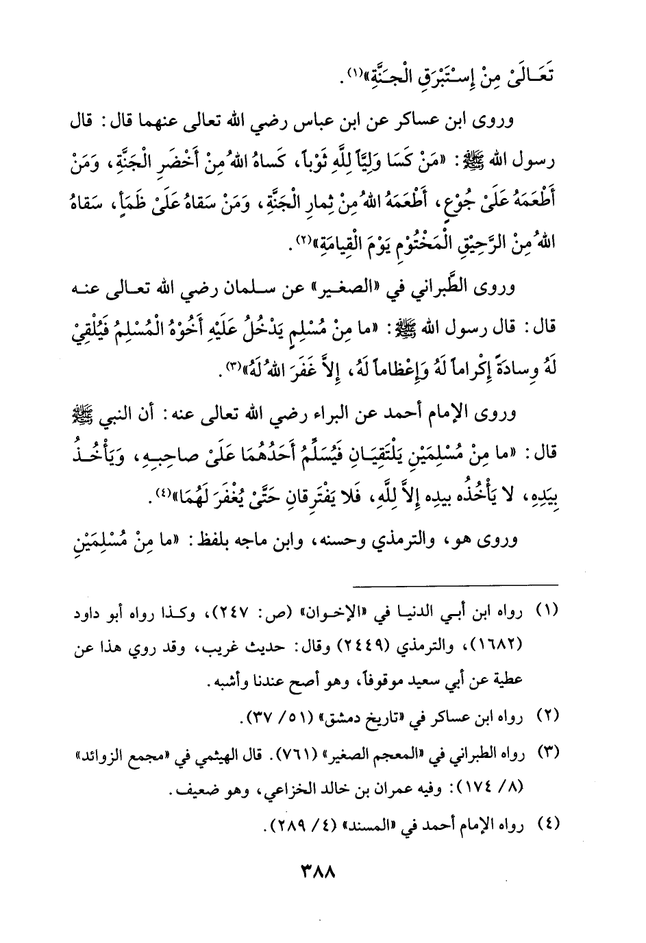 وروى الإمام أحمد عن البراء رضي الله تعالى عنه: أن النبي - صلى الله عليه وسلم - قال: "ما مِنْ مُسْلِمَيْنِ يَلْتَقِيَانِ فَيُسَلِّمُ أَحَدُهُمَا عَلَىْ صاحِبِهِ، وَيَأْخُذُ بِيَدِهِ، لا يَأْخُذُه بيدِه إِلَّا للهِ، فَلا يَفْتَرِقانِ حَتَّى يُغْفَرَ لَهُمَا" (¬4).