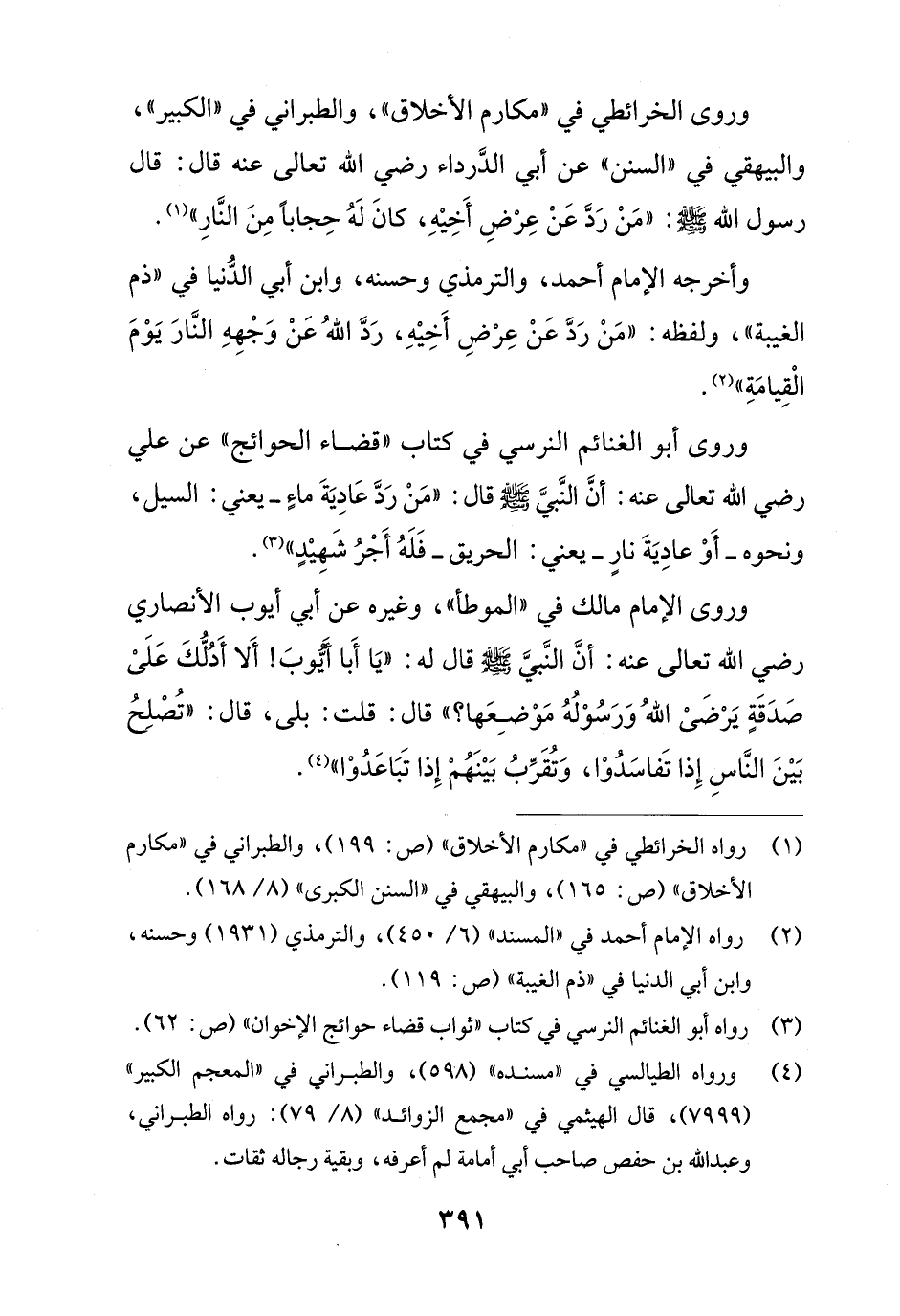 وروى الخرائطي في "مكارم الأخلاق"، والطبراني في "الكبير"، والبيهقي في "السنن" عن أبي الدَّرداء رضي الله تعالى عنه قال: قال رسول الله - صلى الله عليه وسلم -: "مَنْ رَدَّ عَنْ عِرْضِ أَخِيْهِ، كانَ لَهُ حِجابًا مِنَ النَّارِ" (¬1).