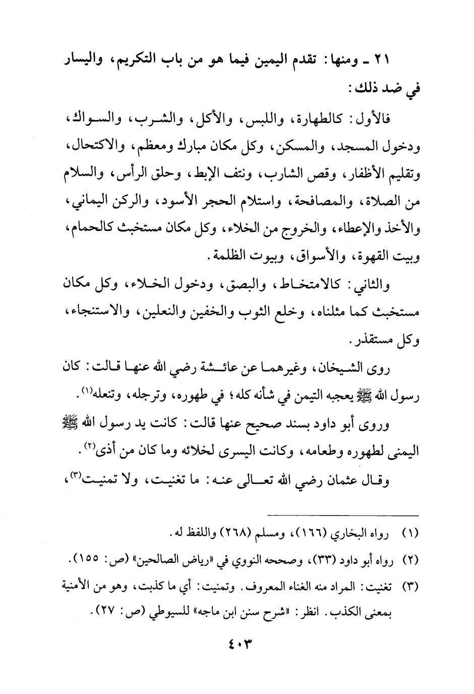21 - ومنها: تقدم اليمين فيما هو من باب التكريم، واليسار في ضد ذلك: