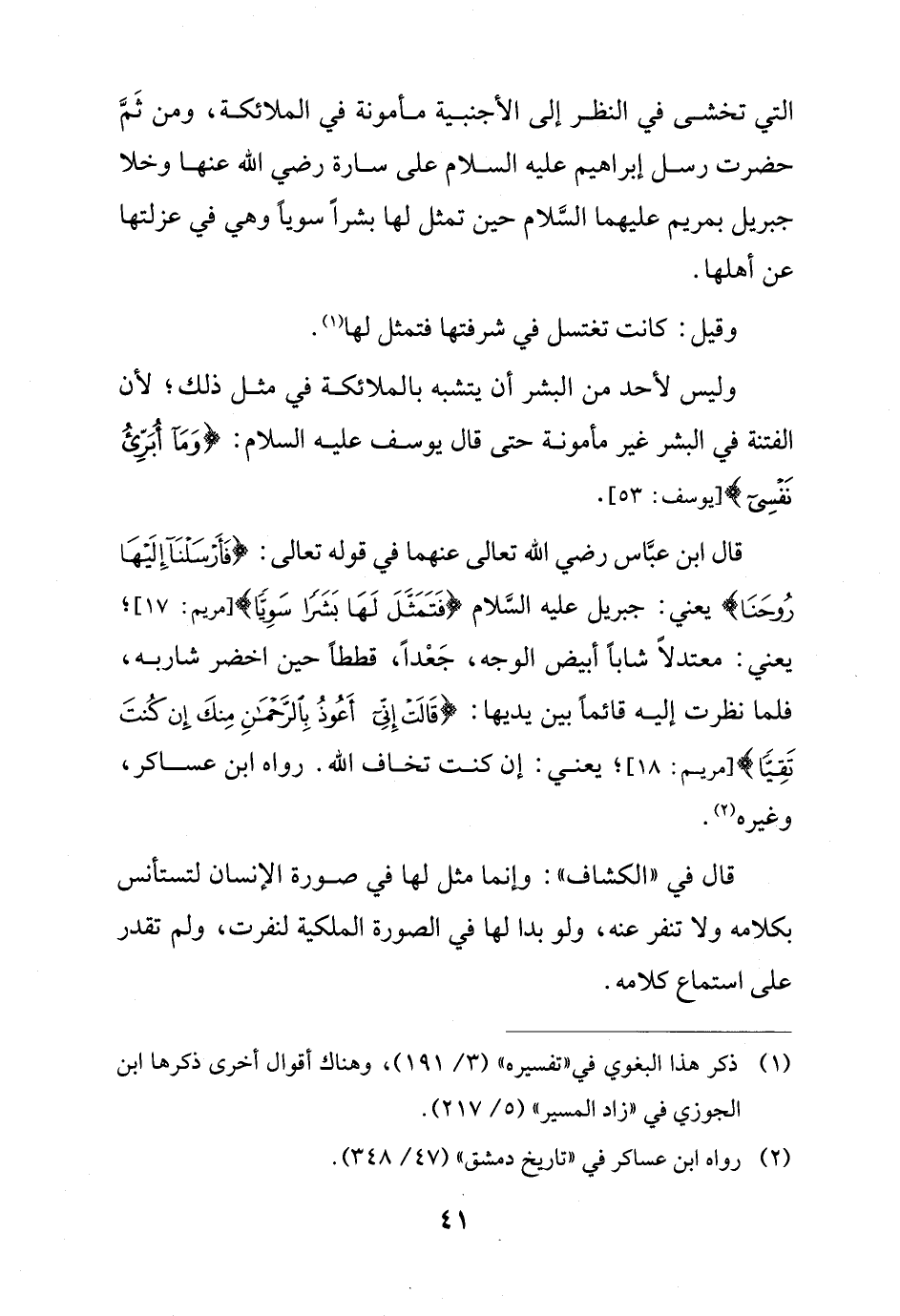 قال ابن عبَّاس رضي الله تعالى عنهما في قوله تعالى: {فَأَرْسَلْنَا إِلَيْهَا رُوحَنَا} يعني: جبريل عليه السَّلام {فَتَمَثَّلَ لَهَا بَشَرًا سَوِيًّا} [مريم: 17]؛ يعني: معتدلاً شاباً أبيض الوجه، جَعْداً، قططا حين اخضر شاربه، فلما نظرت إليه قائماً بين يديها: {قَالَتْ إِنِّي أَعُوذُ بِالرَّحْمَنِ مِنْكَ إِنْ كُنْتَ تَقِيًّا} [مريم: 18]؛ يعني: إن كنت تخاف الله. رواه ابن عساكر، وغيره (¬2).