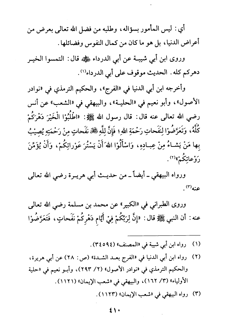 وروى ابن أبي شيبة عن أبي الدرداء - رضي الله عنه - قال: التمسوا الخير دهركم كله. الحديث موقوف على أبي الدرداء (¬1).