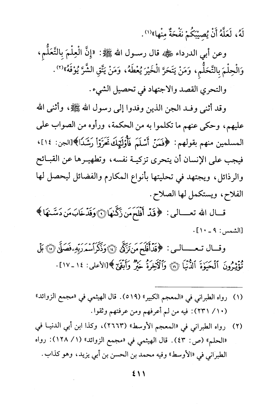 وقد أثنى وفد الجن الذين وفدوا إلى رسول الله - صلى الله عليه وسلم -، وأثنى الله عليهم، وحكى عنهم ما تكلموا به من الحكمة، ورأوه من الصواب على المسلمين منهم بقولهم: {فَمَنْ أَسْلَمَ فَأُولَئِكَ تَحَرَّوْا رَشَدًا} [الجن: 14]، فيجب على الإنسان أن يتحرى تزكية نفسه، وتطهيرها عن القبائح والرذائل، ويجتهد في تحليتها بأنواع المكارم والفضائل ليحصل لها الفلاح، ويستكمل لها الصلاح.