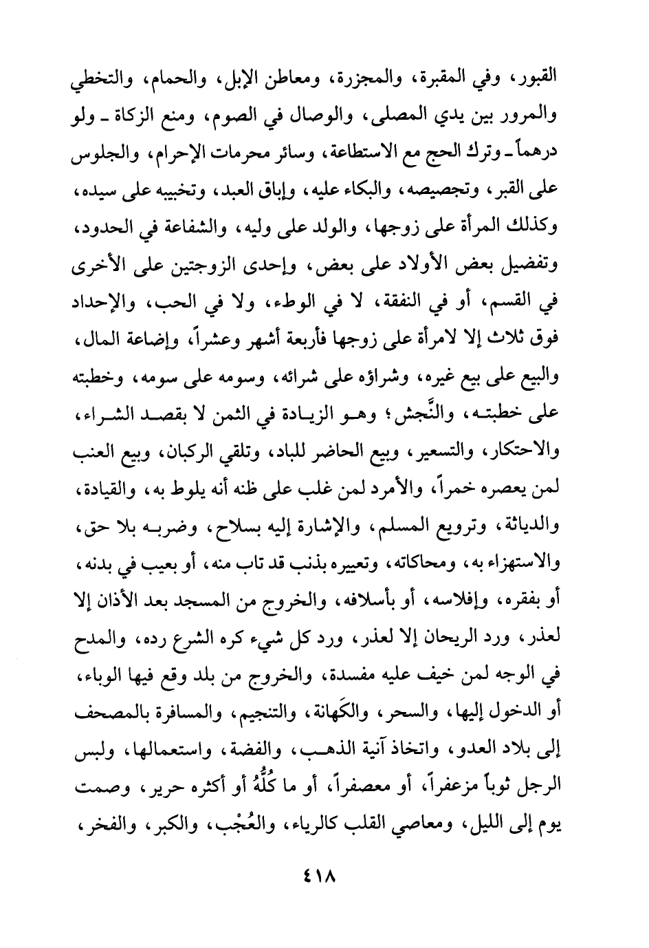 القبور، وفي المقبرة، والمجزرة، ومعاطن الإبل، والحمام، والتخطي والمرور بين يدي المصلى، والوصال في الصوم، ومنع الزكاة -ولو درهمًا- وترك الحج مع الاستطاعة، وسائر محرمات الإحرام، والجلوس على القبر، وتجصيصه، والبكاء عليه، وإباق العبد، وتخبيبه على سيده، وكذلك المرأة على زوجها، والولد على وليه، والشفاعة في الحدود، وتفضيل بعض الأولاد على بعض، وإحدى الزوجتين على الأخرى في القسم، أو في النفقة، لا في الوطء، ولا في الحب، والإحداد فوق ثلاث إلا لامرأة على زوجها فأربعة أشهر وعشرًا، وإضاعة المال، والبيع على بيع غيره، وشراؤه على شرائه، وسومه على سومه، وخطبته على خطبته، والنَّجش؛ وهو الزيادة في الثمن لا بقصد الشراء، والاحتكار، والتسعير، وبيع الحاضر للباد، وتلقي الركبان، وبيع العنب لمن يعصره خمرًا، والأمرد لمن غلب على ظنه أنه يلوط به، والقيادة، والدياثة، وترويع المسلم، والإشارة إليه بسلاح، وضربه بلا حق، والاستهزاء به، ومحاكاته، وتعييره بذنب قد تاب منه، أو بعيب في بدنه، أو بفقره، وإفلاسه، أو بأسلافه، والخروج من المسجد بعد الأذان إلا لعذر، ورد الريحان إلا لعذر، ورد كل شيء كره الشرع رده، والمدح في الوجه لمن خيف عليه مفسدة، والخروج من بلد وقع فيها الوباء، أو الدخول إليها، والسحر، والكَهانة، والتنجيم، والمسافرة بالمصحف إلى بلاد العدو، واتخاذ آنية الذهب، والفضة، واستعمالها، ولبس الرجل ثوبًا مزعفرًا، أو معصفرًا، أو ما كُلُّهُ أو أكثره حرير، وصمت يوم إلى الليل، ومعاصي القلب كالرياء، والعُجْب، والكبر، والفخر،