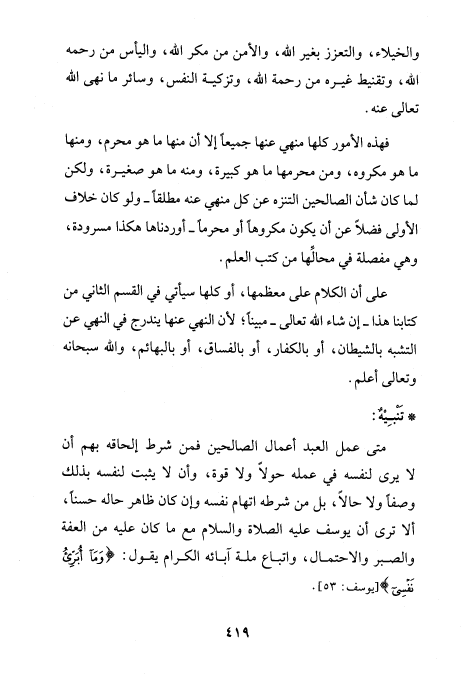 متى عمل العبد أعمال الصالحين فمن شرط إلحاقه بهم أن لا يرى لنفسه في عمله حولًا ولا قوة، وأن لا يثبت لنفسه بذلك وصفًا ولا حالًا، بل من شرطه اتهام نفسه وإن كان ظاهر حالة حسنًا، ألا ترى أن يوسف عليه الصلاة والسلام مع ما كان عليه من العفة والصبر والاحتمال، واتباع ملة آبائه الكرام يقول: {وَمَا أُبَرِّئُ نَفْسِي} [يوسف: 53].