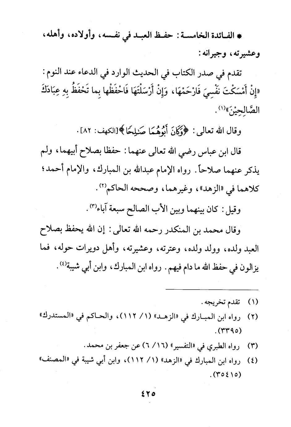 وقال محمد بن المنكدر رحمه الله تعالى: إن الله يحفظ بصلاح العبد ولده، وولد ولده، وعترته، وعشيرته، وأهل دويرات حوله، فما يزالون في حفظ الله ما دام فيهم. رواه ابن المبارك، وابن أبي شيبة (¬4).