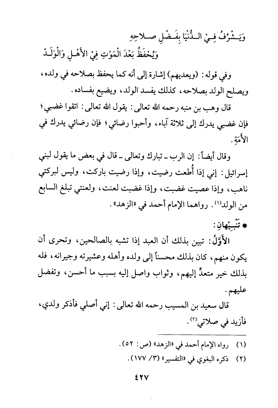 وَيشْرُفُ فِيْ الدُّنْيَا بِفَضْلِ صلاحِهِ ... وُيحْفَظُ بَعْدَ الْمَوْتِ فِيْ الأَهْلِ وَالْوَلَدْ