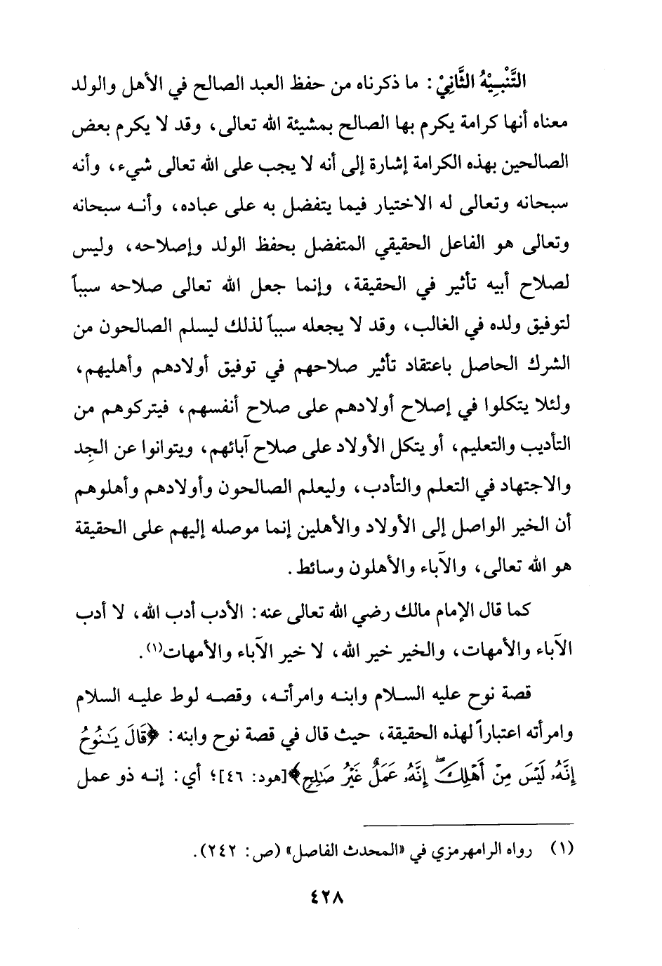التَّنْبِيْهُ الثَّانِيْ: ما ذكرناه من حفظ العبد الصالح في الأهل والولد معناه أنها كرامة يكرم بها الصالح بمشيئة الله تعالى، وقد لا يكرم بعض الصالحين بهذه الكرامة إشارة إلى أنه لا يجب على الله تعالى شيء، وأنه سبحانه وتعالى له الاختيار فيما يتفضل به على عبادة، وأنه سبحانه وتعالى هو الفاعل الحقيقي المتفضل بحفظ الولد وإصلاحه، وليس لصلاح أبيه تأثير في الحقيقة، وإنما جعل الله تعالى صلاحه سببًا لتوفيق ولده في الغالب، وقد لا يجعله سببًا لذلك ليسلم الصالحون من الشرك الحاصل باعتقاد تأثير صلاحهم في توفيق أولادهم وأهليهم، ولئلا يتكلوا في إصلاح أولادهم على صلاح أنفسهم، فيتركوهم من التأديب والتعليم، أو يتكل الأولاد على صلاح آبائهم، ويتوانوا عن الجِد والاجتهاد في التعلم والتأدب، وليعلم الصالحون وأولادهم وأهلوهم أن الخير الواصل إلى الأولاد والأهلين إنما موصلة إليهم على الحقيقة هو الله تعالى، والآباء والأهلون وسائط.