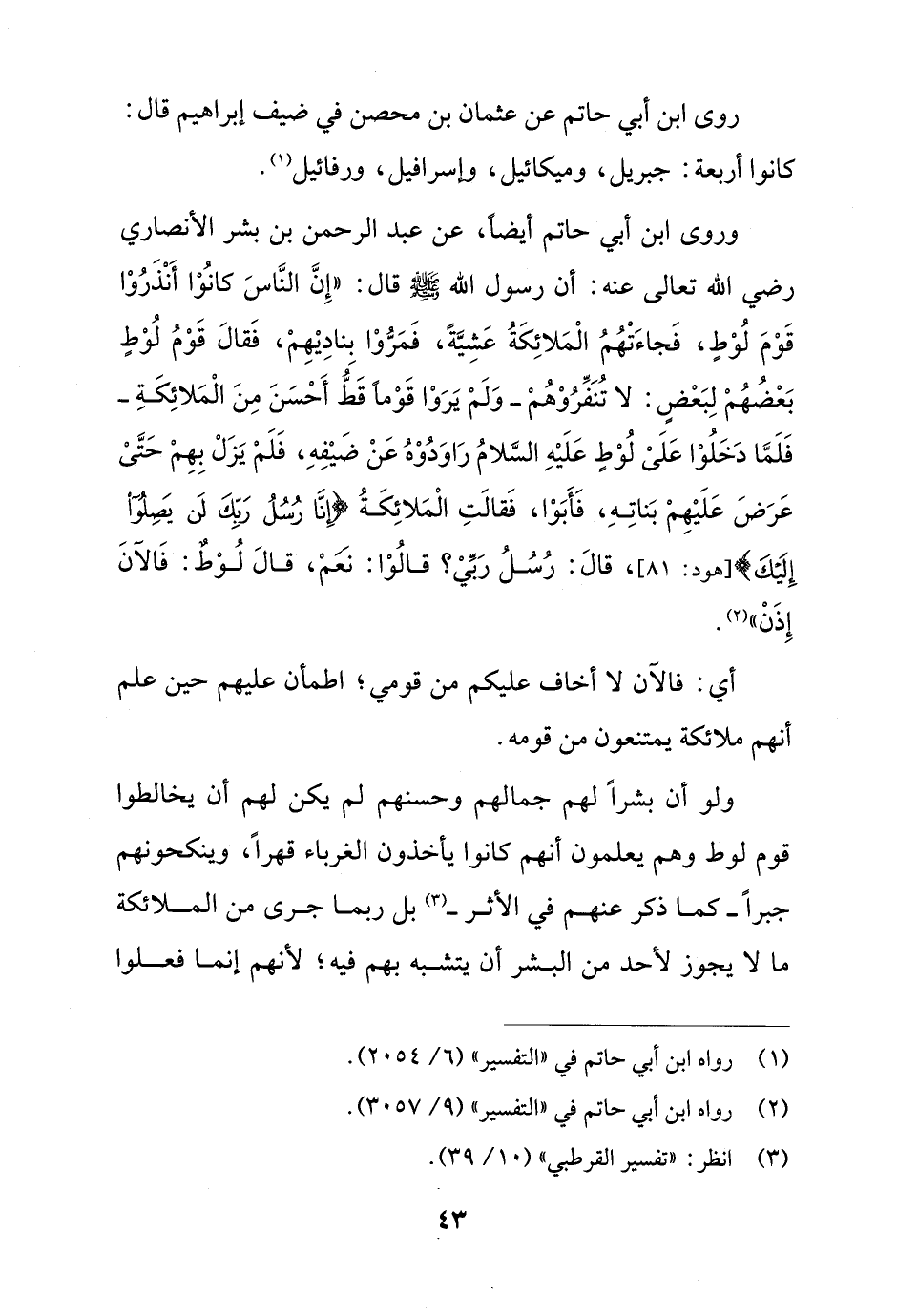 روى ابن أبي حاتم عن عثمان بن محصن في ضيف إبراهيم قال: كانوا أربعة: جبريل، وميكائيل، وإسرافيل، ورفائيل (¬1).