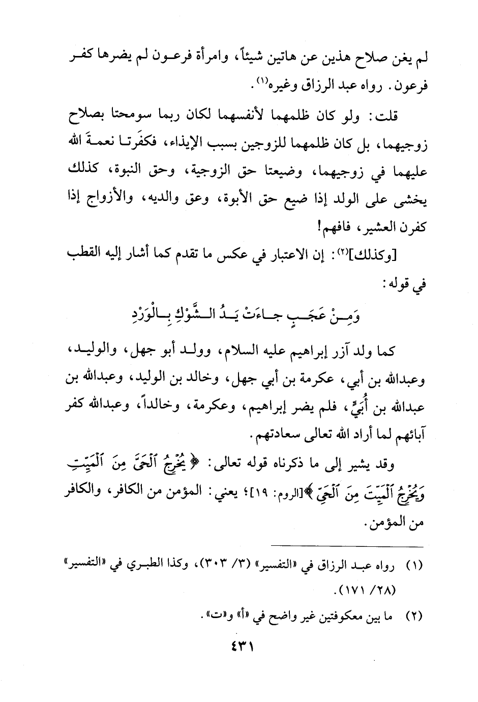 لم يغن صلاح هذين عن هاتين شيئًا، وامرأة فرعون لم يضرها كفر فرعون. رواه عبد الرزاق وغيره (¬1).