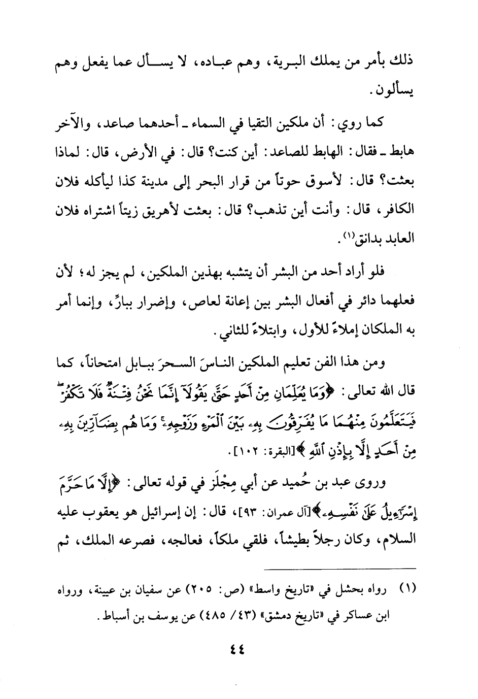 فلو أراد أحد من البشر أن يتشبه بهذين الملكين، لم يجز له؛ لأن فعلهما دائر في أفعال البشر بين إعانة لعاص، وإضرار ببارِّ، وإنما أمر به الملكان إملاءً للأول، وابتلاءً للثاني.