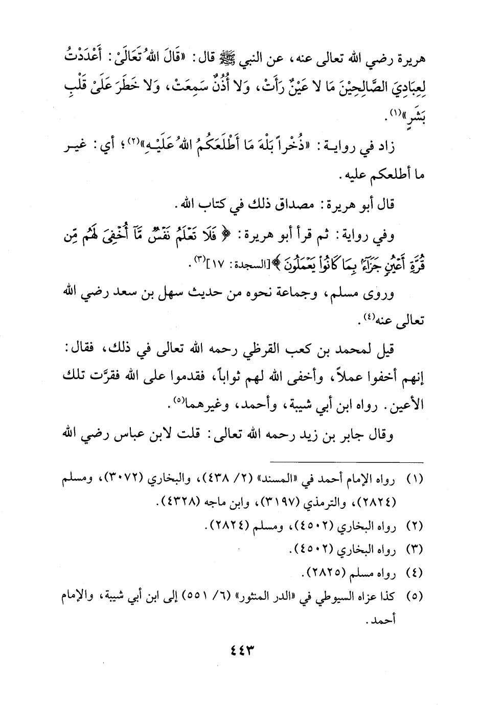 هريرة رضي الله تعالى عنه، عن النبي - صلى الله عليه وسلم - قال: "قَالَ اللهُ تَعَالَى: أَعْدَدْتُ لِعِبَادِيَ الصَّالِحِيْنَ مَا لا عَيْن رَأَتْ، وَلا أُذُنٌ سَمِعَتْ، وَلا خَطَرَ عَلَىْ قَلْبِ بَشَرٍ" (¬1).