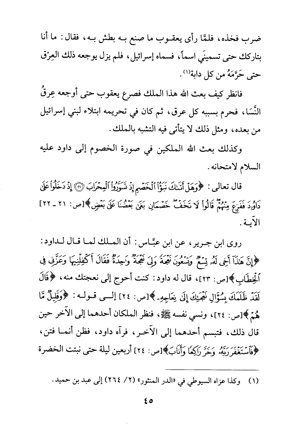 روى ابن جرير، عن ابن عبَّاس: أن الملك لما قال لداود: {إِنَّ هَذَا أَخِي لَهُ تِسْعٌ وَتِسْعُونَ نَعْجَةً وَلِيَ نَعْجَةٌ وَاحِدَةٌ فَقَالَ أَكْفِلْنِيهَا وَعَزَّنِي فِي الْخِطَابِ} [ص: 23]، قال له داود: كنت أحوج إلى نعجتك منه، {قَالَ لَقَدْ ظَلَمَكَ بِسُؤَالِ نَعْجَتِكَ إِلَى نِعَاجِهِ} [ص: 24] إلى قوله: {وَقَلِيلٌ مَا هُمْ} [ص: 24]، ونسي نفسه - صلى الله عليه وسلم -، فنظر الملكان أحدهما إلى الآخر حين قال ذلك، فتبسم أحدهما إلى الآخر، فرآه داود، فظن أنما فتن، {فَاسْتَغْفَرَ رَبَّهُ وَخَرَّ رَاكِعًا وَأَنَابَ} [ص: 24] أربعين ليلة حتى نبتت الخضرة