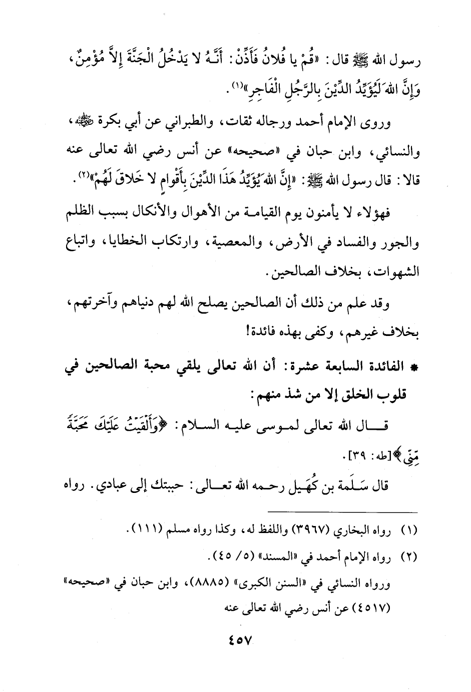 وروى الإمام أحمد ورجاله ثقات، والطبراني عن أبي بكرة - رضي الله عنه -، والنسائي، وابن حبان في "صحيحه" عن أنس رضي الله تعالى عنه قالا: قال رسول الله - صلى الله عليه وسلم -: "إِنَّ اللهَ يُؤَيِّدُ هَذَا الدِّيْنَ بِأَقْوامٍ لا خَلاقَ لَهُمْ" (¬2).