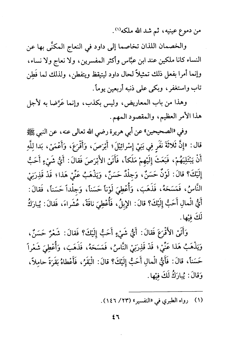 والخصمان اللذان تخاصما إلى داود في النعاج المكنَّى بها عن النساء كانا ملكين عند ابن عبَّاس وأكثر المفسرين، ولا نعاج ولا نساء، وإنما أمرا بفعل ذلك تمثيلاً لحال داود ليتيقظ ويتفطن، ولذلك لما فَطِن تاب واستغفر، وبكى على ذنبه أربعين يوماً.
