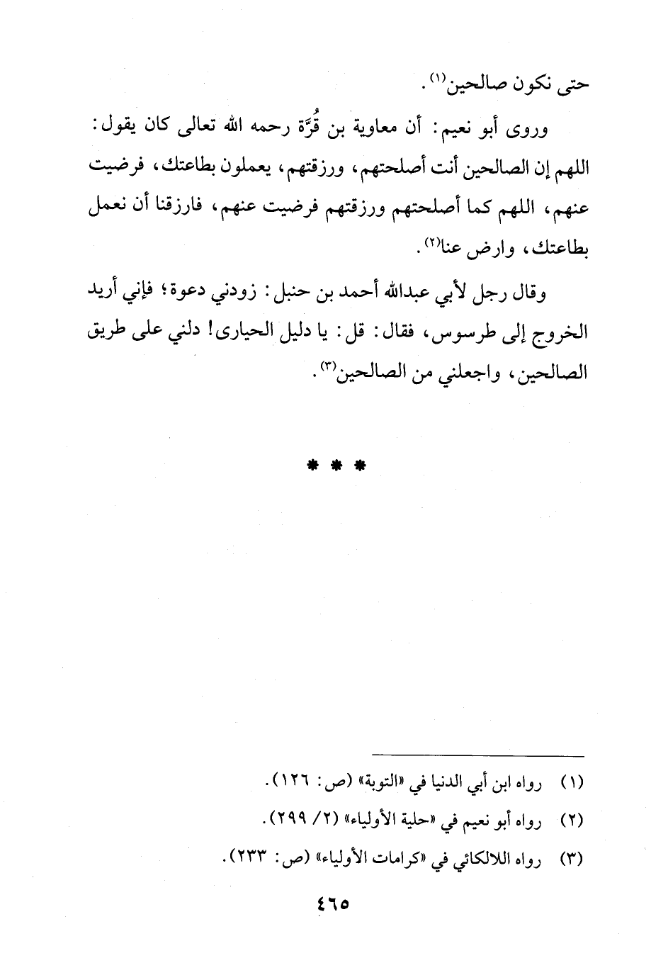 وقال رجل لأبي عبد الله أحمد بن حنبل: زودني دعوة؛ فإني أريد الخروج إلى طرسوس، فقال: قل: يا دليل الحيارى! دلني على طريق الصالحين، واجعلني من الصالحين (¬3).