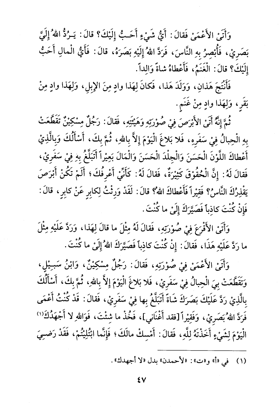 ثُمَّ إِنَّهُ أَتَىْ الأَبْرَصَ فِيْ صُوْريهِ وَهَيْئَتِهِ، فَقالَ: رَجُلٌ مِسْكِيْنٌ تَقَطَّعَتْ بِهِ الْحِبالُ فِيْ سَفَرِهِ، فَلا بَلاغَ الْيَوْمَ إِلاَّ بِاللهِ، ثُمَّ بِكَ، أَسْألكَ وَبِالَّذِيْ أَعْطاكَ اللَّوْنَ الْحَسَنَ وَالْجِلْدَ الْحَسَنَ وَالْمَالَ بَعِيْراً أتَبَلَّغُ بِةِ فِيْ سَفَرِيْ، فَقالَ لَهُ: إِنَّ الْحُقُوْقَ كَثِيْرةٌ، فَقالَ لَهُ: كَأنَّي أَعْرِفُكَ؛ أَلَمْ تَكُنْ أَبْرَصَ يَقْذِرُكَ النَّاسُ؟ فَقِيْراً فَأَعْطاكَ اللهُ؟ قالَ: لَقَدْ وَرِثْتُ لِكابِرٍ عَنْ كابِرٍ، قالَ: فَإِنْ كُنْتَ كاذِباً فَصَيَّرَكَ إِلَىْ ما كُنْتَ.