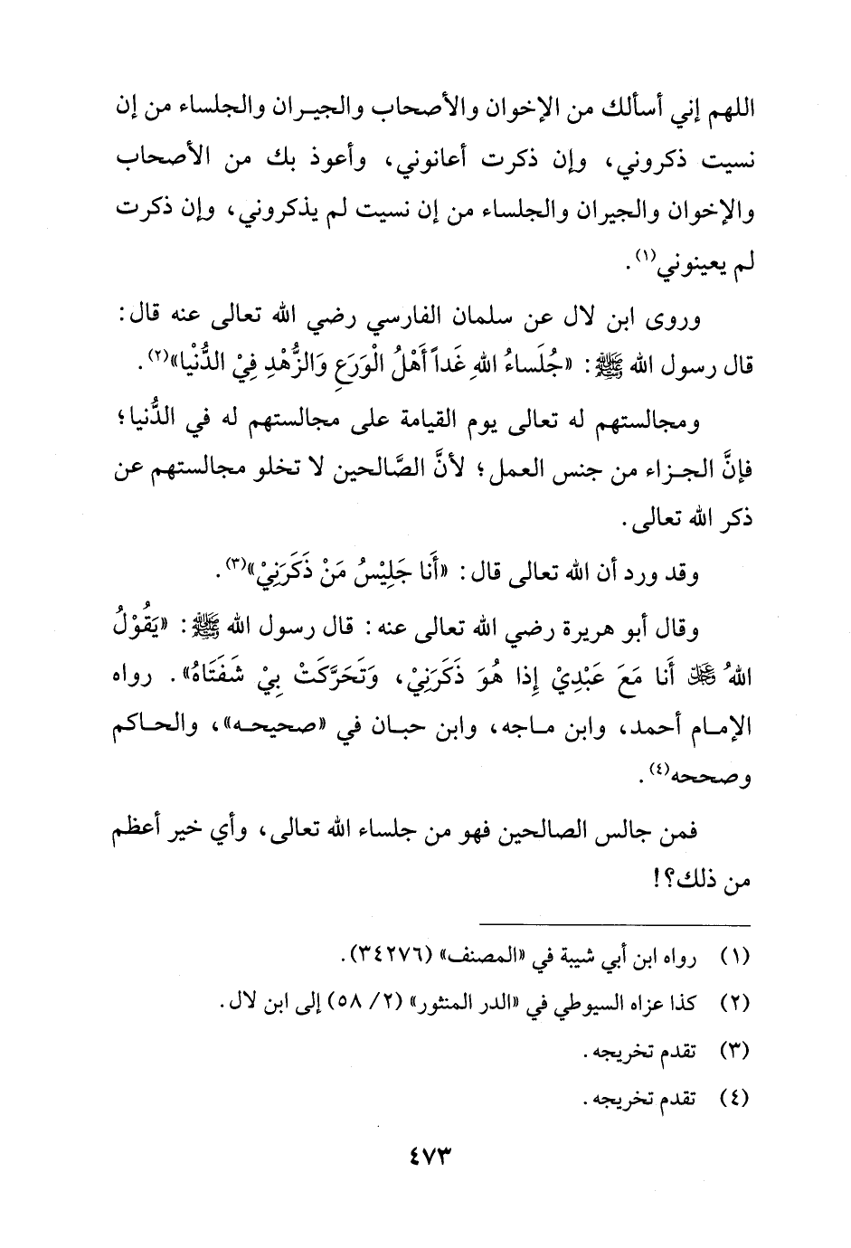 اللهم إني أسألك من الإخوان والأصحاب والجيران والجلساء من إن نسيت ذكروني، كان ذكرت أعانوني، وأعوذ بك من الأصحاب والإخوان والجيران والجلساء من إن نسيت لم يذكروني، كان ذكرت لم يعينوني (¬1).