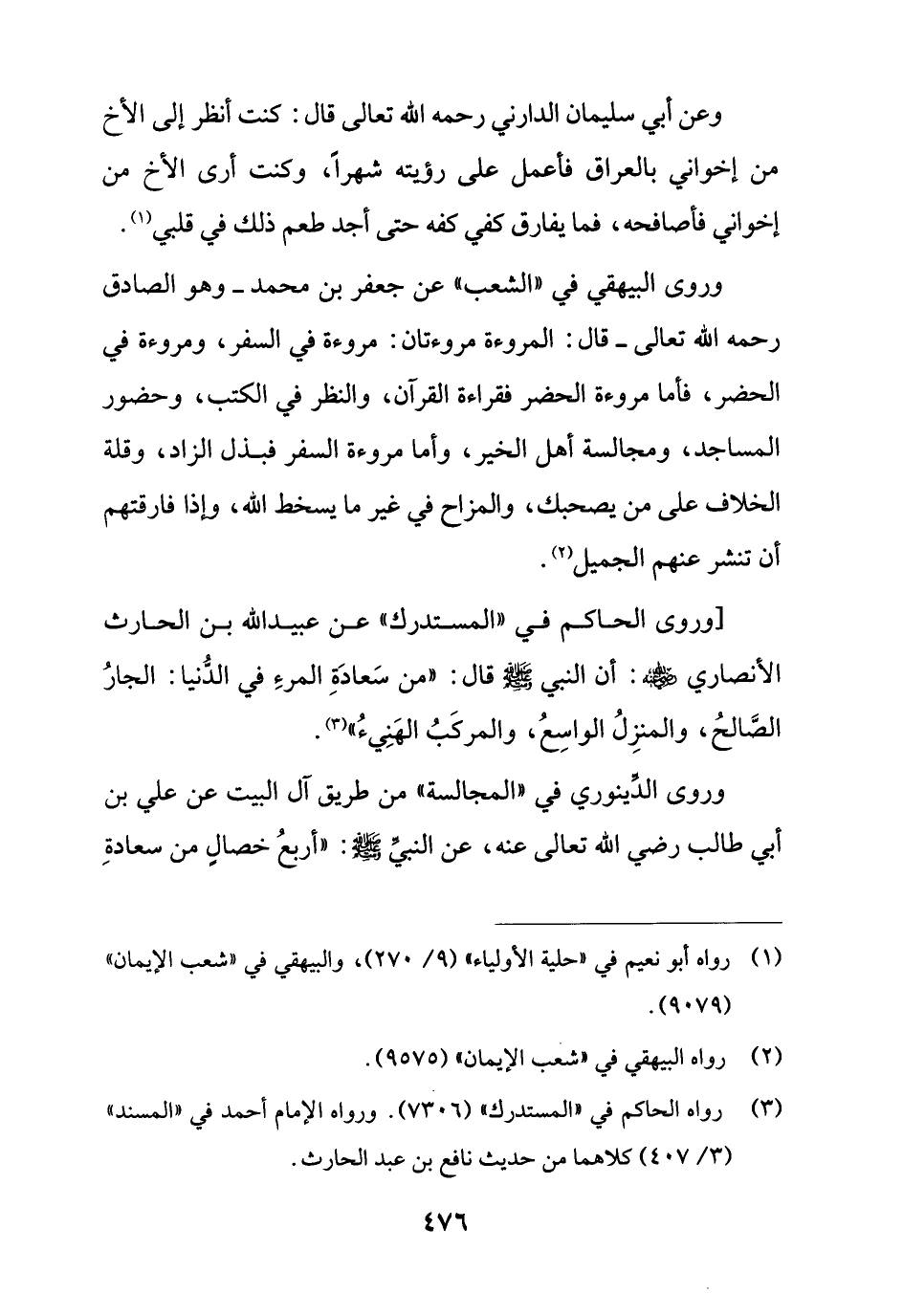 وروى البيهقي في "الشعب" عن جعفر بن محمد - وهو الصادق رحمه الله تعالى - قال: المروءة مروءتان: مروءة في السفر، ومروءة في الحضر، فأما مروءة الحضر فقراءة القرآن، والنظر في الكتب، وحضور المساجد، ومجالسة أهل الخير، وأما مروءة السفر فبذل الزاد، وقلة الخلاف على من يصحبك، والمزاح في غير ما يسخط الله، وإذا فارقتهم أن تنشر عنهم الجميل (¬2).