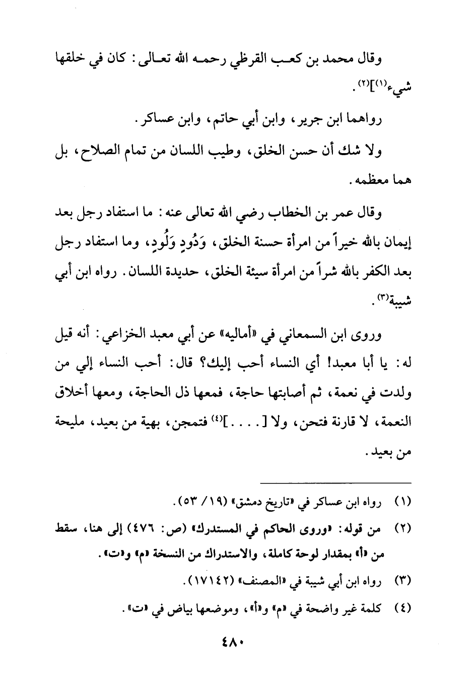 وقال عمر بن الخطاب رضي الله تعالى عنه: ما استفاد رجل بعد إيمان بالله خيراً من امرأة حسنة الخلق، وَدُودٍ وَلُودٍ، وما استفاد رجل بعد الكفر بالله شراً من امرأة سيئة الخلق، حديدة اللسان. رواه ابن أبي شيبة (¬3).
