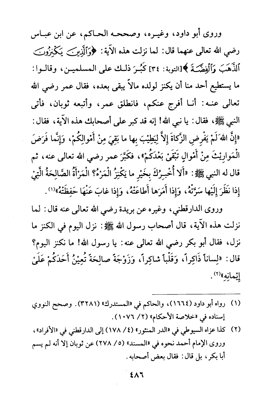 وروى أبو داود، وغيره، وصححه الحاكم، عن ابن عباس رضي الله تعالى عنهما قال: لما نزلت هذه الآية: {وَالَّذِينَ يَكْنِزُونَ الذَّهَبَ وَالْفِضَّةَ} [التوبة: 34]، كَبُرَ ذلك على المسلمين، وقالوا: ما يستطيع أحد منا أن يكنز لولده مالاً يبقى بعده، فقال عمر رضي الله تعالى عنه: أنا أفرج عنكم، فانطلق عمر، وأتبعه ثوبان، فأتى النبي - صلى الله عليه وسلم -، فقال: يا نبي الله! إنه قد كبر على أصحابك هذه الآية، فقال: "إِنَّ اللهَ لَمْ يَفْرِضِ الزَّكاةَ إِلاَّ لِيَطِيْبَ بِها ما بَقِيَ مِنْ أَمْوالِكُمْ، وَإِنَّما فَرَضَ الْمَواريثَ مِنْ أَمْوالٍ تَبْقَىْ بَعْدَكُمْ"، فكَبَّرَ عمر رضي الله تعالى عنه، ثم قال له النبي - صلى الله عليه وسلم -: " أَلا أُخْبِرُكَ بِخَيْرِ ما يَكْنِزُ الْمَرْءُ؟ الْمَرْأَةُ الصَّالِحَةُ الَّتِيْ إِذا نظًرَ إِلَيْها سَرَّتْهُ، وَإِذا أَمَرَها أَطاعَتْهُ، وَإِذا غابَ عَنْهَا حَفِظَتْهُ" (¬1).