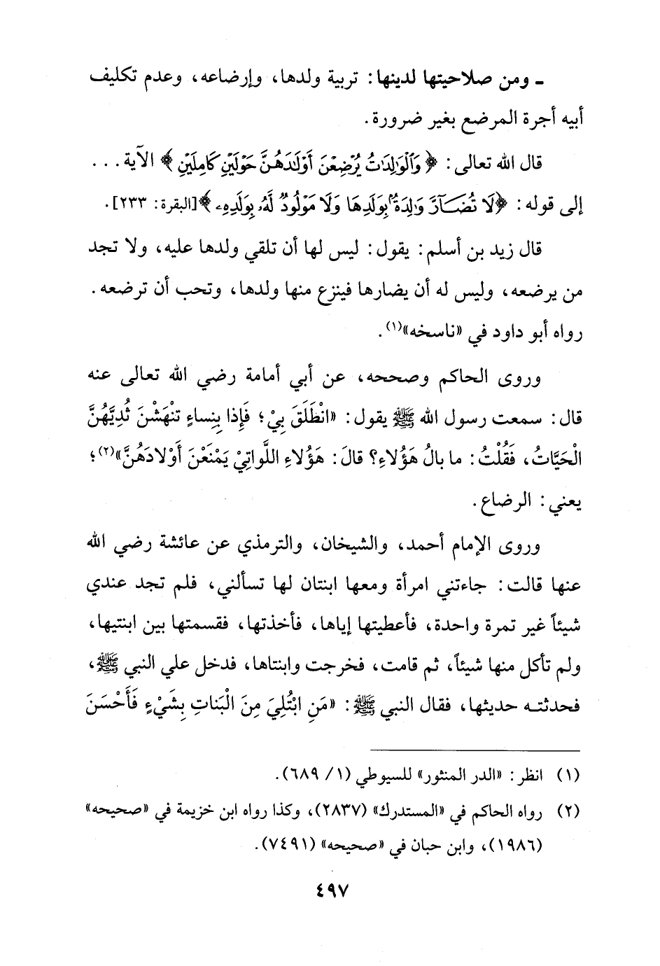 - ومن صلاحيتها لدينها: تربية ولدها، وإرضاعه، وعدم تكليف أبيه أجرة المرضع بغير ضرورة.