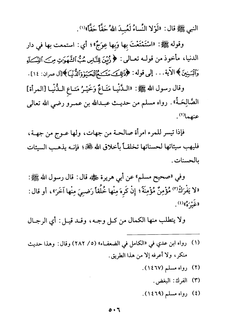 وقال رسول الله - صلى الله عليه وسلم -: "الدَّنْيا مَتَاعٌ وَخَيْرُ مَتاعِ الدُّنْيا [المرأة] الصَّالِحَةُ". رواه مسلم من حديث عبد الله بن عمرو رضي الله تعالى عنهما (¬2).